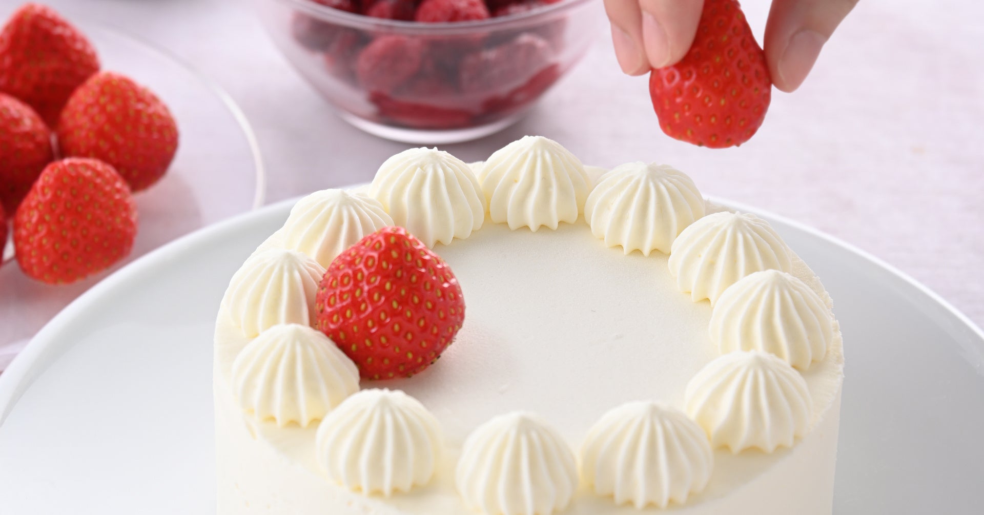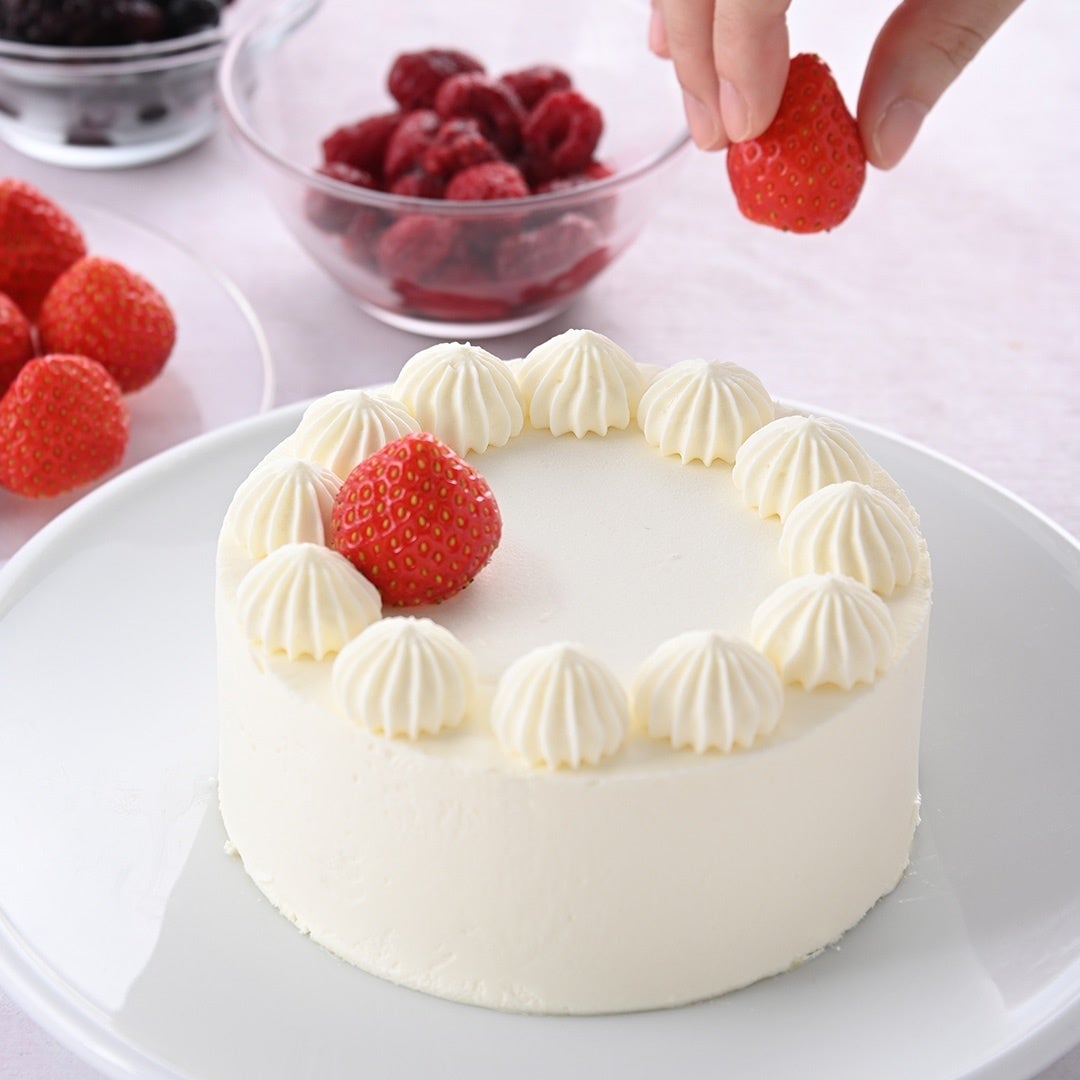 真っ白なケーキに何をのせる?スポンジの間には、生クリームやいちごの果肉入りジュレ、いちごクリームをはさみました。飾って楽しい、食べておいしいクリスマスケーキをどうぞ。