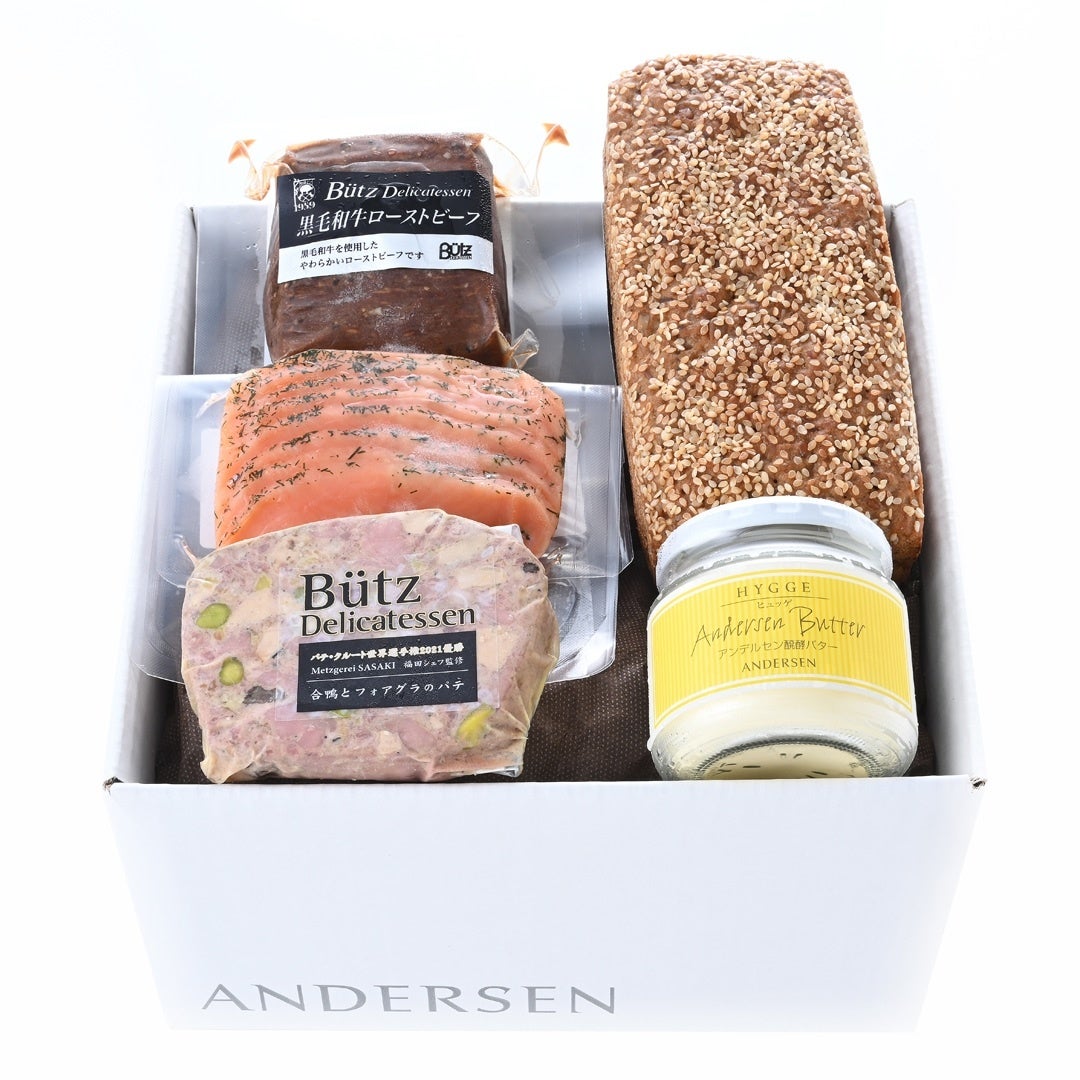 デンマークのパン「ラグブロート」と、スメアブロ(オープンサンドイッチ)におすすめのローストビーフやサーモン・パテがセットになりました。スライスしたパンに醗酵バターを塗って楽しみましょう!