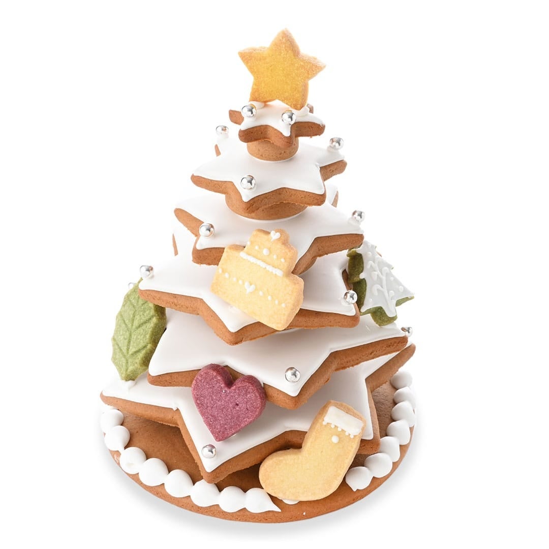 クリスマスツリーの手づくりキット。星型のクッキーやクリスマスモチーフの飾り、シュガーグラスなどが入っているので、届いてすぐに組み立てられます。今年は自分だけのオリジナルツリーをつくって楽しみませんか?