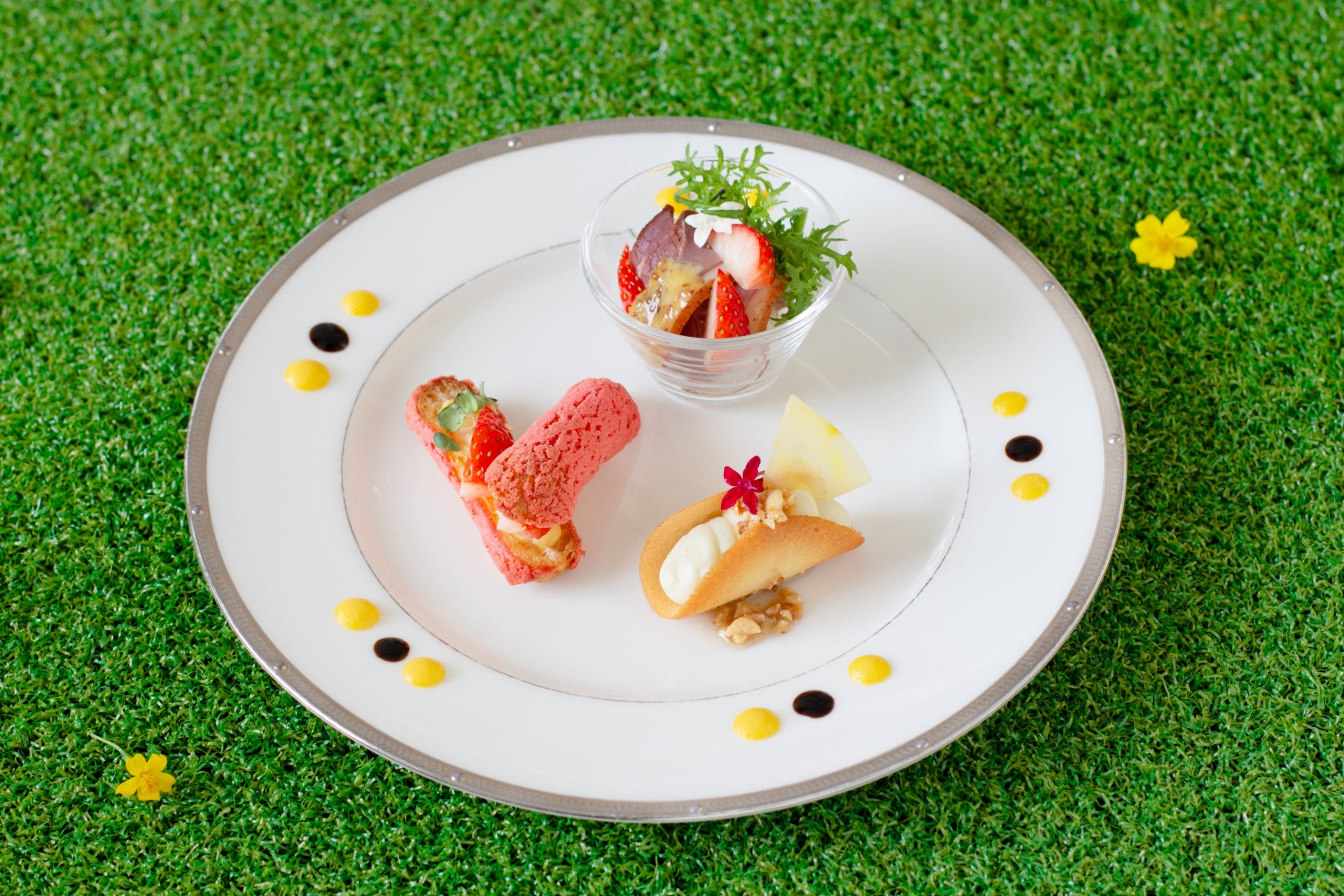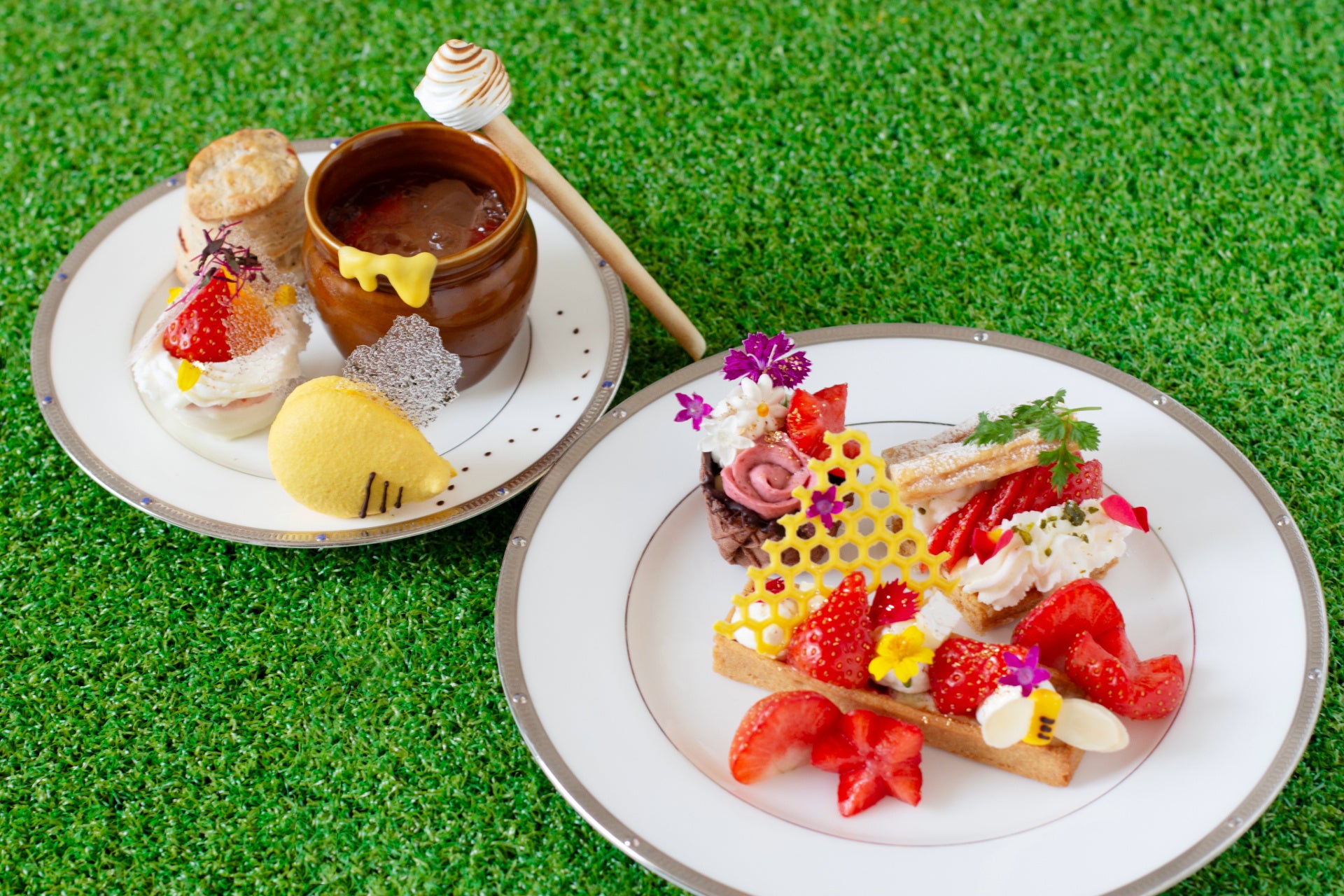スイーツは、じゅわっとしたいちごのクラフティにクリーミーなカマンベールを重ね甘味と酸味のバランスのとれたタルトレット、ぶんぶんと羽音を鳴らしながら陽気に飛びまわるミツバチのマカロン、ハニーポットに敷き詰められたきらきらと輝くジンジャーハニーをすくって楽しむなど、パティシエの遊び心が光ります。