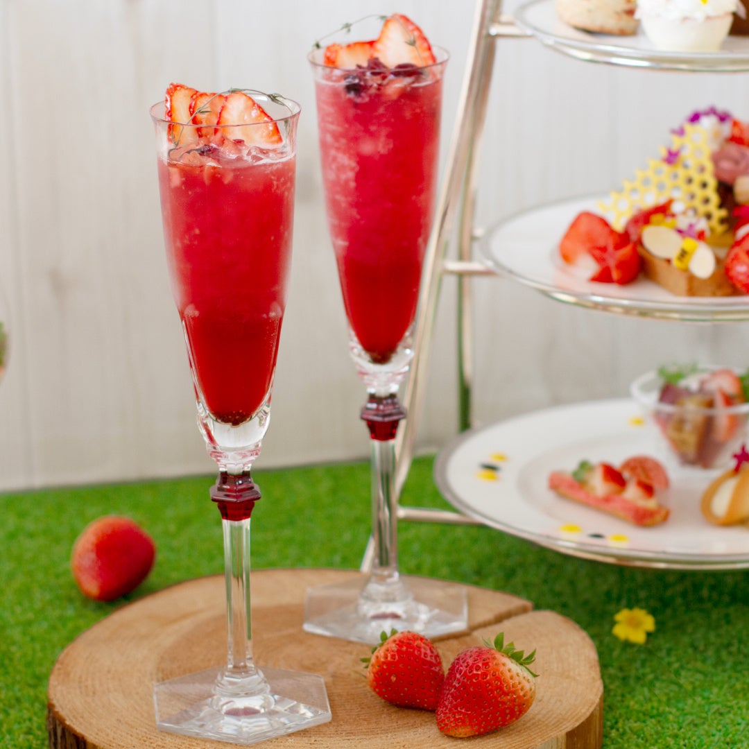 バーテンダー考案、この時期だけの大人な紅茶のノンアルコールドリンク「Strawberry Field」。実り広がるいちご畑をイメージし、艶やかに赤く色づき、摘みたてのように香る一杯です。