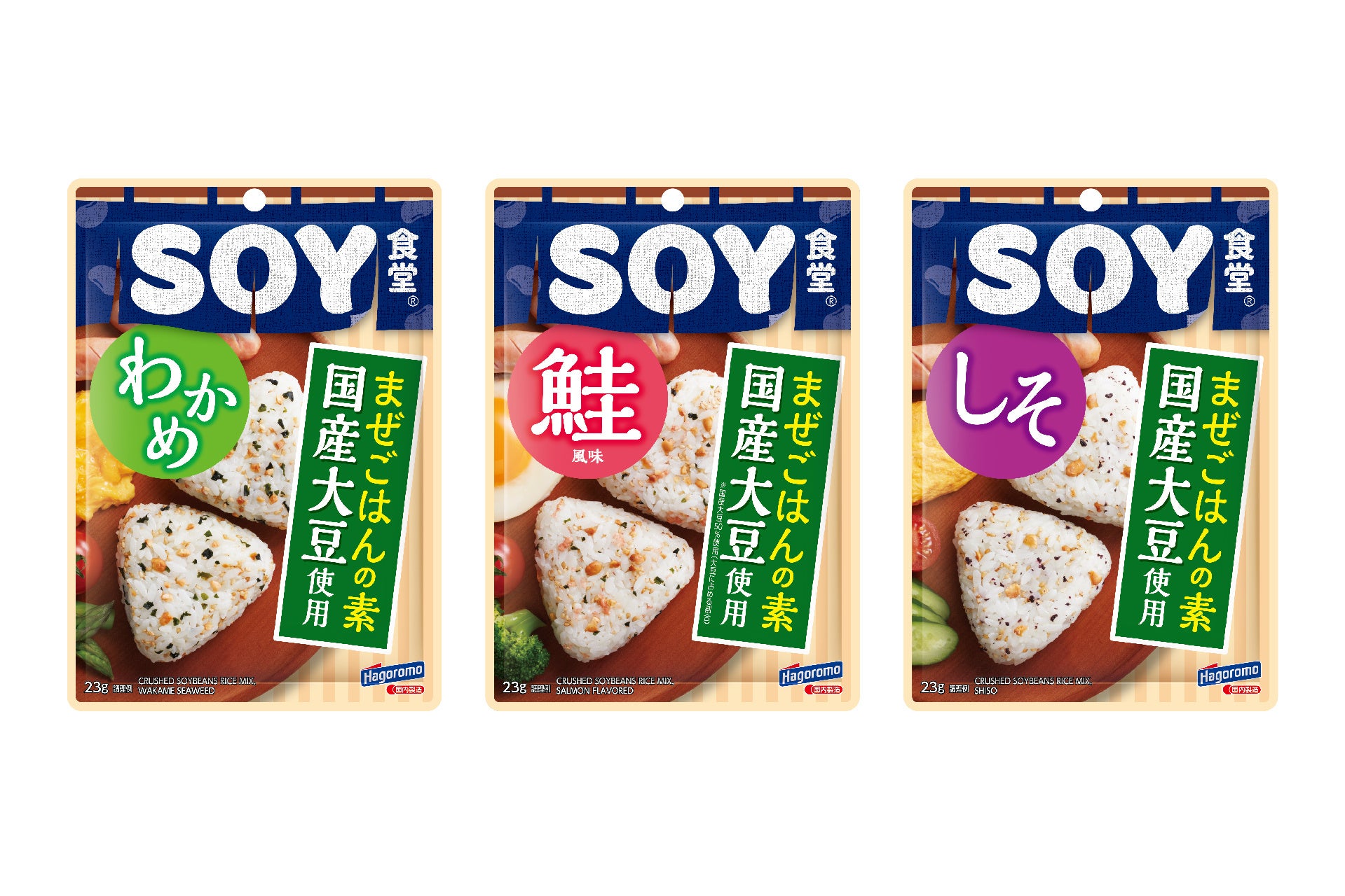 “まぜごはんの素”の定番具材である、わかめ・しそ・鮭風味と組み合わせて、食べやすく馴染みのある味に仕上げました。煎り大豆を砕いたカリカリッとした食感と、お米のもっちりした食感との違いをお楽しみいただけます。ネーミングは“大豆”よりも若い世代に親しみのある英語の“SOY”を使い、大豆を使っていることがひと目でわかるPOPなデザインで、気軽に手に取っていただけるようにしました。