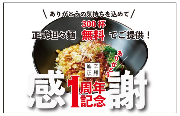 正式担々麺 進辛正麺が開店より1周年を迎えました。1周年を記念して、300杯無料でご提供!