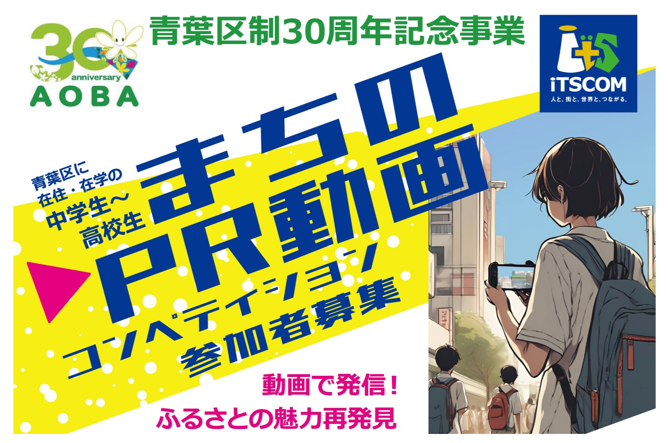 東急線沿線(横浜市青葉区を含む)のコミュニティメディア(ケーブルテレビ事業、コミュニティFM事業)を運営するイッツ・コミュニケーションズ株式会社(本社:東京都世田谷区 メディアセンター:横浜市青葉区 代表取締役社長:金井美惠 以下、イッツコム)は、青葉区制30周年記念事業実行委員会*1の共催で、中高生による「まちのPR動画」を公募するコンペティションを開催いたします。