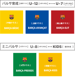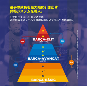 バルサアカデミー広島校では、選手それぞれの「意識レベル」「プレーレベル」が最も適した選手同士でプレーすることが選手の成長を最大限引き出すことができると考えています。そのため、バルサ育成クラス(経験者)とバルサキッズクラス(入門・初級クラス)を用意し、小学校2年生までは、自分のレベルと意識に合わせてクラスを選べるように設定しております。選手としての成長に意識が芽生えた選手たちには育成クラスにおいて、ブロックごとにテクニカルディレクターと担当コーチが選手たちに成長度をチェックされ、努力を怠っている選手のクラス降格、成長している選手のクラス昇格を行います。A+からCまでの6段階で今のレベルを評価し、昇格したこと降格したことに一喜一憂するのではなく、今何が足りないのか? 今自分が目指す目的地に向かってどうやっていくのか?を選手が考えコーチ達はそれをサポートして行きます。どんな環境でも「サッカーを学ぶ」姿勢を持ち続けること、本気でチャレンジして達成した時の楽しさを身につけてもらう意図があります。
