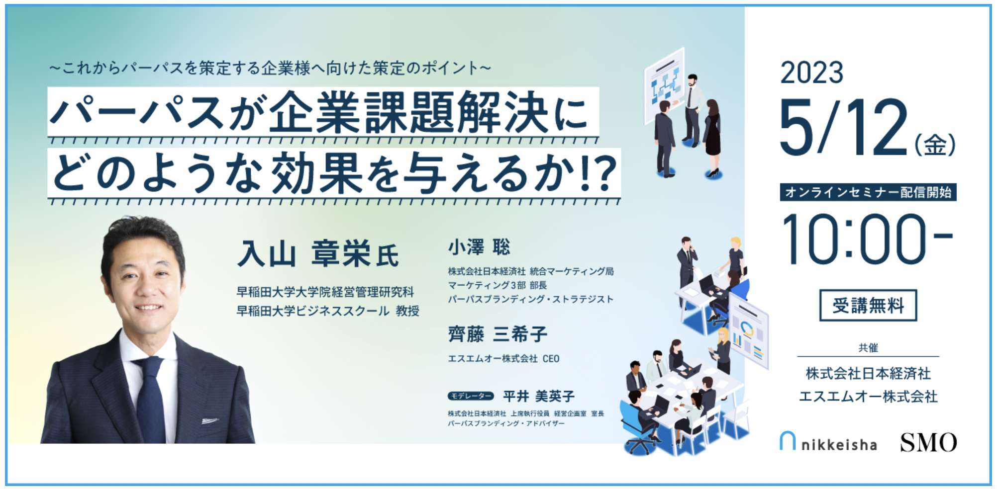 パーパス・ブランディングの先駆者として、パーパスを起点としたコンサルティングを行うエスエムオー株式会社(本社:東京都港区、代表取締役:齊藤三希子 以下、エスエムオー)は、株式会社日本経済社(本社:東京都港区、代表取締役社長:北村 真一郎 以下、日経社)と共同で、5月12日から、期間限定配信の形で、早稲田大学大学院 早稲田大学ビジネススクール 教授の入山章栄氏をお迎えし、オンラインセミナーを開催いたします。