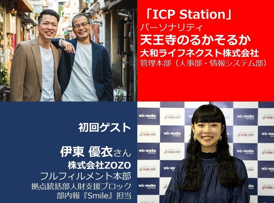 パーソナリティを務めるのは、大和ライフネクスト株式会社に勤務する“サラリーマン芸人コンビ”「天王寺のるかそるか」さん。軽妙なトークでゲストICPの取り組み内容について聞き出していきます。初回のゲストは、株式会社ZOZO フルフィルメント本部 拠点統括部人財支援ブロックで、部内報『Smile』の運営に携わる伊東優衣さんで、2023年4月18日(火)10:00公開です。