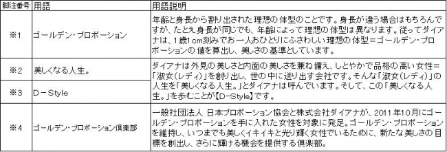 ※4 ゴールデン・プロポーション倶楽部:一般社団法人 日本プロポーション協会と株式会社ダイアナが、2011年10月にゴ ールデン・プロポーションを手に入れた女性を対象に発足。ゴールデン・プロポーションを維持し、いつまでも美しくイキイキと光り輝く女性でいるために、新たな美しさの目標を創出し、さらに輝ける機会を提供する倶楽部。