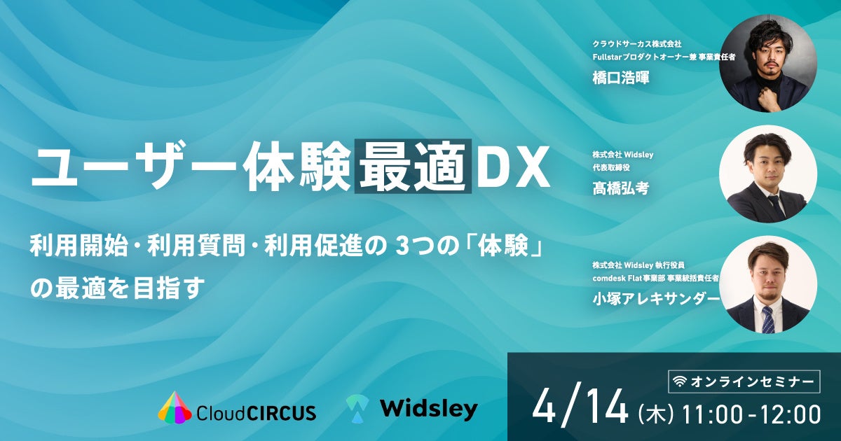 株式会社Widsley(本社:東京都渋谷区、代表取締役 髙橋弘考、以下ウィズリー)は、デジタルマーケティングSaaS事業を手掛けるクラウドサーカス株式会社(本社:東京都、代表:北村健一)と合同で、企業のカスタマーサクセス/カスタマーサポート担当者が取り組むべき『ユーザー体験の最適化』をテーマにしたオンラインセミナーを4月14日(木)午前11時より開催いたします。