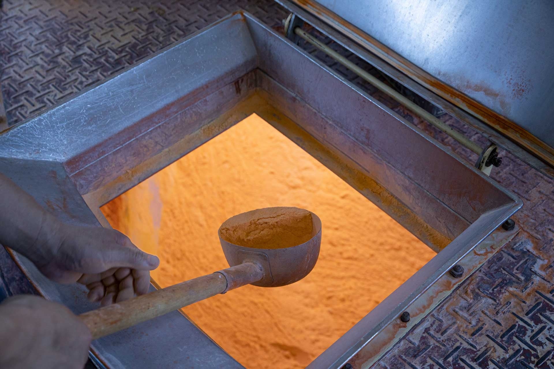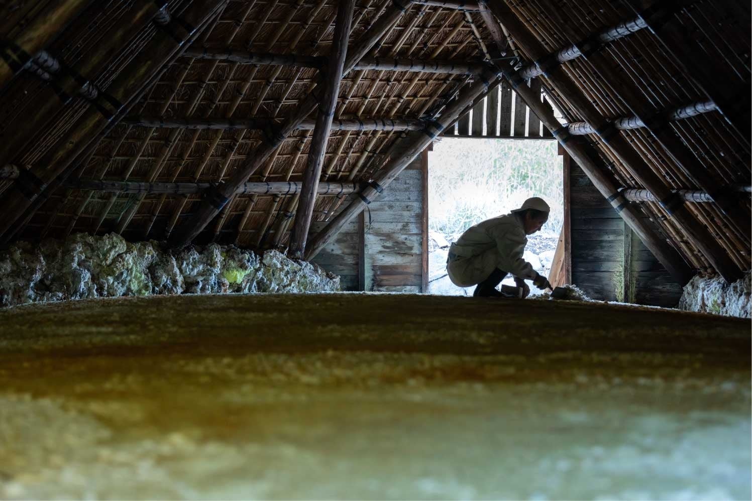 湯の花エキスを湯に溶かすと強い酸性のお湯になります。一般的に酸性の温泉は殺菌作用が期待されますが、刺激が強いため湯あたりに注意が必要です。そのため特性を活かしつつも、ご家庭で毎日お使いいただける理想的なお湯を求めて、湯の花エキスを肌にやさしくなめらかな湯質が特長のアルカリ性温泉の成分と掛け合わせます。酸性の湯の花エキスと正反対のアルカリ性成分を混ぜ合わせると激しく反応するため、温熱と冷却を加えることにより反応を制御しながら両者を一体化させます。さらに製品がお客様の手元に届いた後も、長く安定した品質を保てるよう、20 時間以上かけて熟成させます。仕上げは、手作りしていた創業当時のままに、現在も熟練の社員が反応を直に確かめながら行っています。
