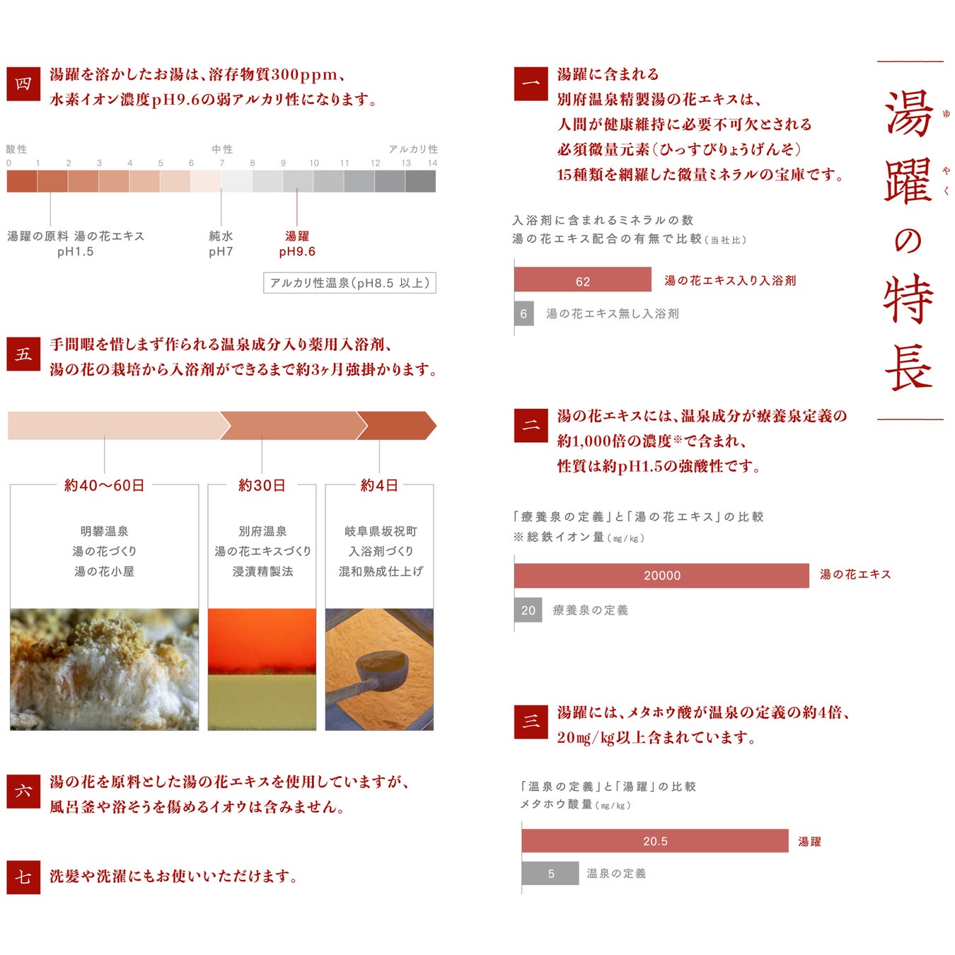 別府温泉の天然湯の花を精製し、エキスとして基剤配合した薬用入浴剤「湯躍」を代表とする湯の花配合製品のメーカー。創業以来60年の間、一貫して別府温泉の効能を追求して製造を行っております。