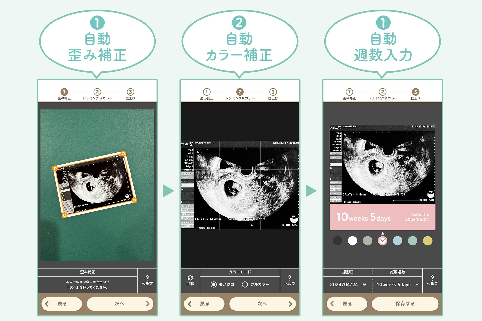 時と共に色褪せ、いずれ消えてしまう感熱紙のエコー写真を簡単にずっと残すことができます。エコー写真をスマートフォンで複写した際の画像の歪みや傾きを自動で補正!さらに、色調補正や妊娠週数記録、フレームカラー選択でお気に入りの一枚が作れます。