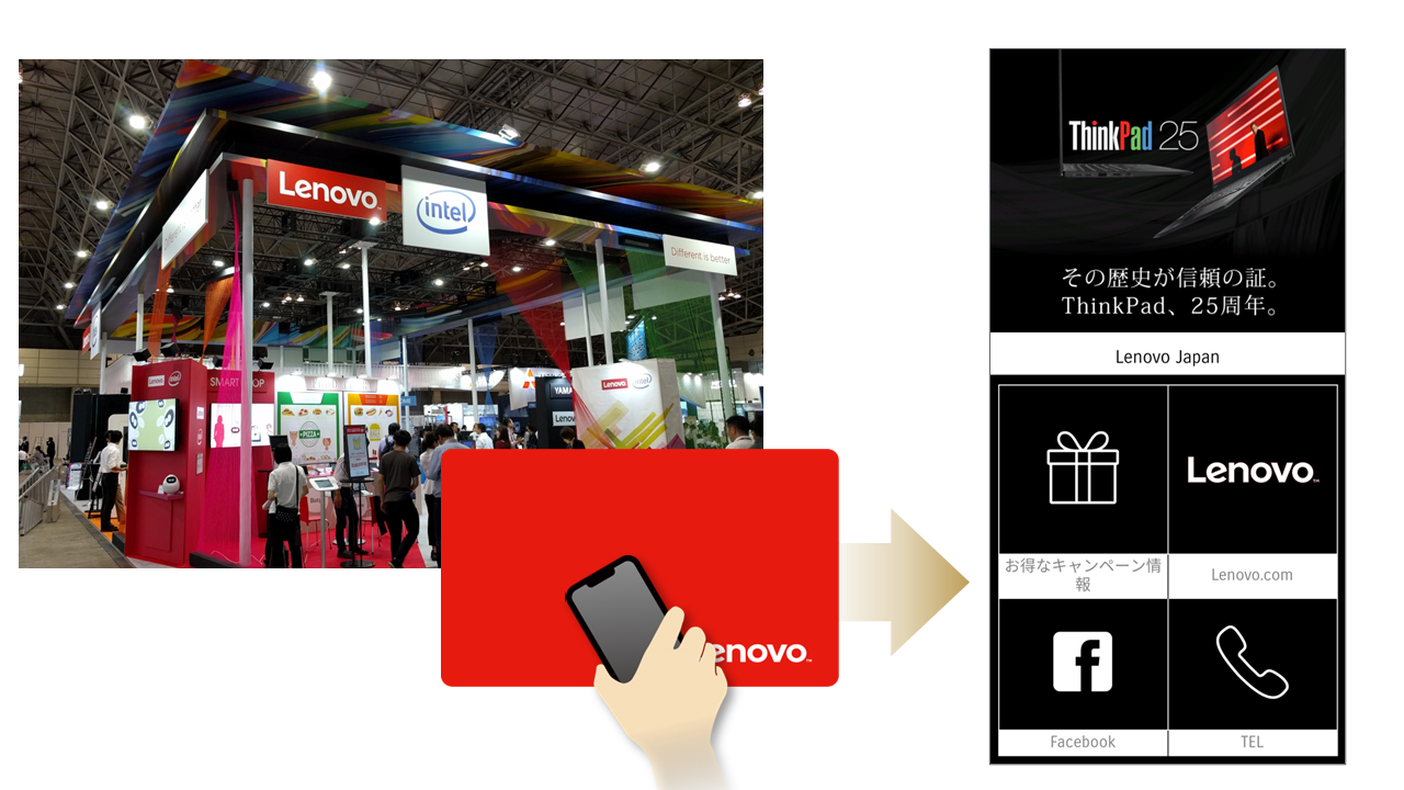 Lenovoの展示会ブースでは、来場者に配布したカード型スマートプレートから製品情報ページへアクセスできる仕組みを提供。展示会のリアル接点をオンラインマーケティングへつなげる導線として活用されました。