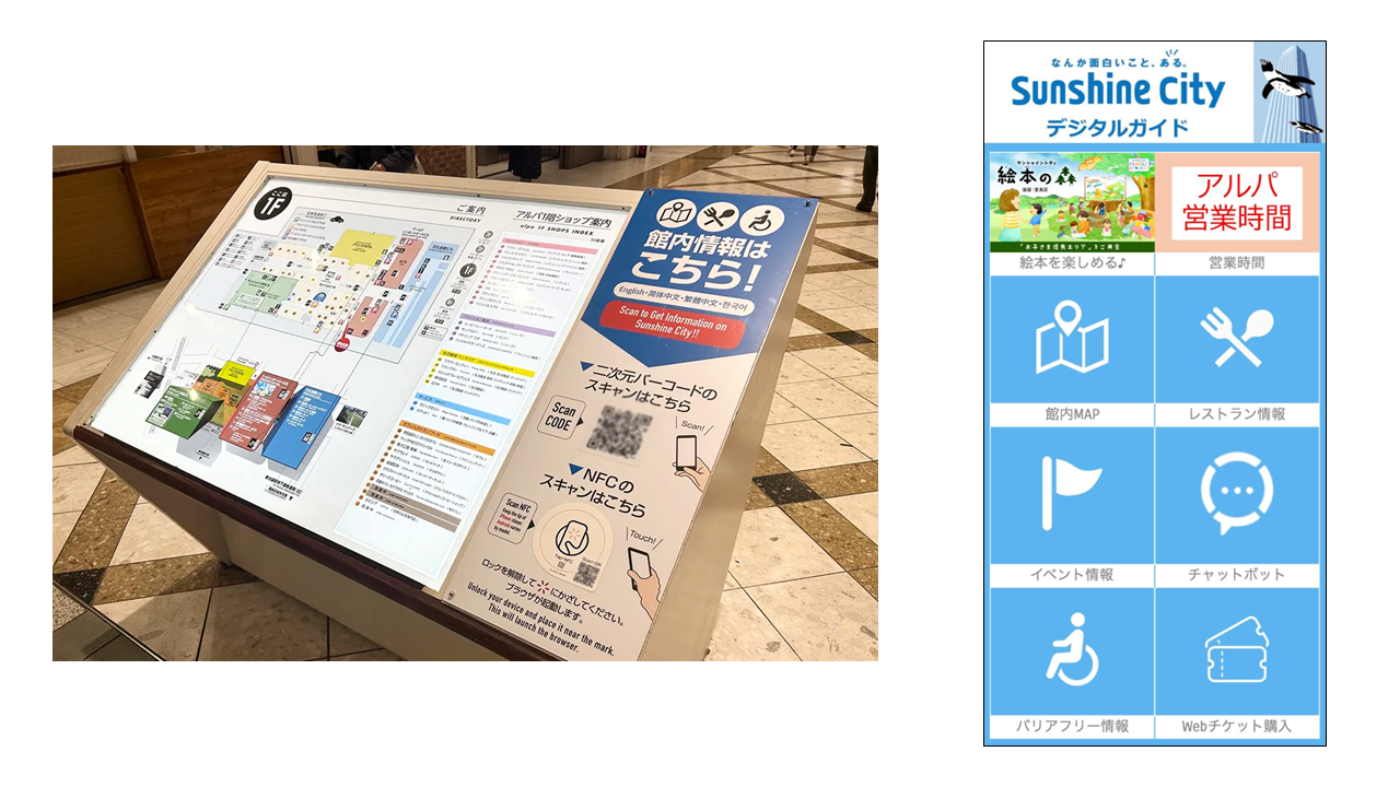 大型複合施設「サンシャインシティ」では、館内各所に設置されたスマートプレートから、時期に合わせた最新情報をタイル型ランディングページで配信。さらにスマートフォンの言語設定に応じて、日本語・英語・中国語・韓国語などの多言語表示にも対応しました。