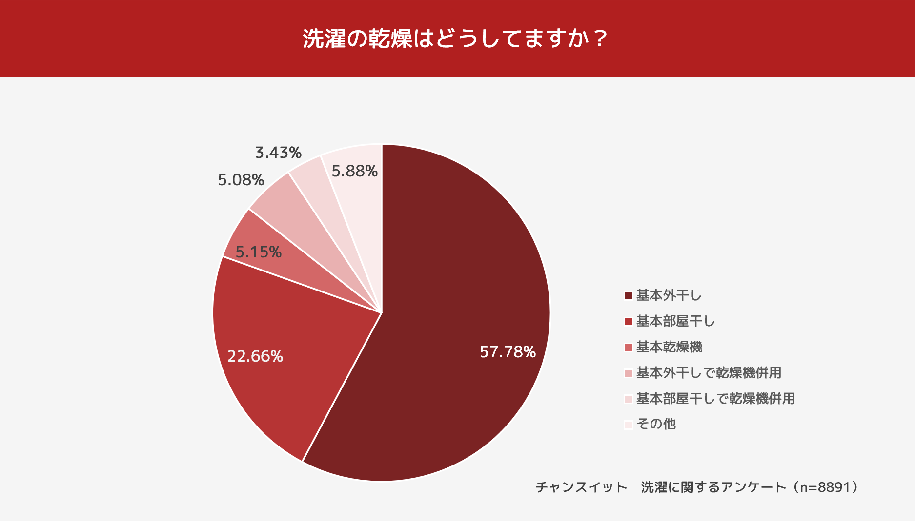 「基本外干し」が57.78%、「基本部屋干し」が22.66%、基本乾燥機「5.15%」という結果でした。