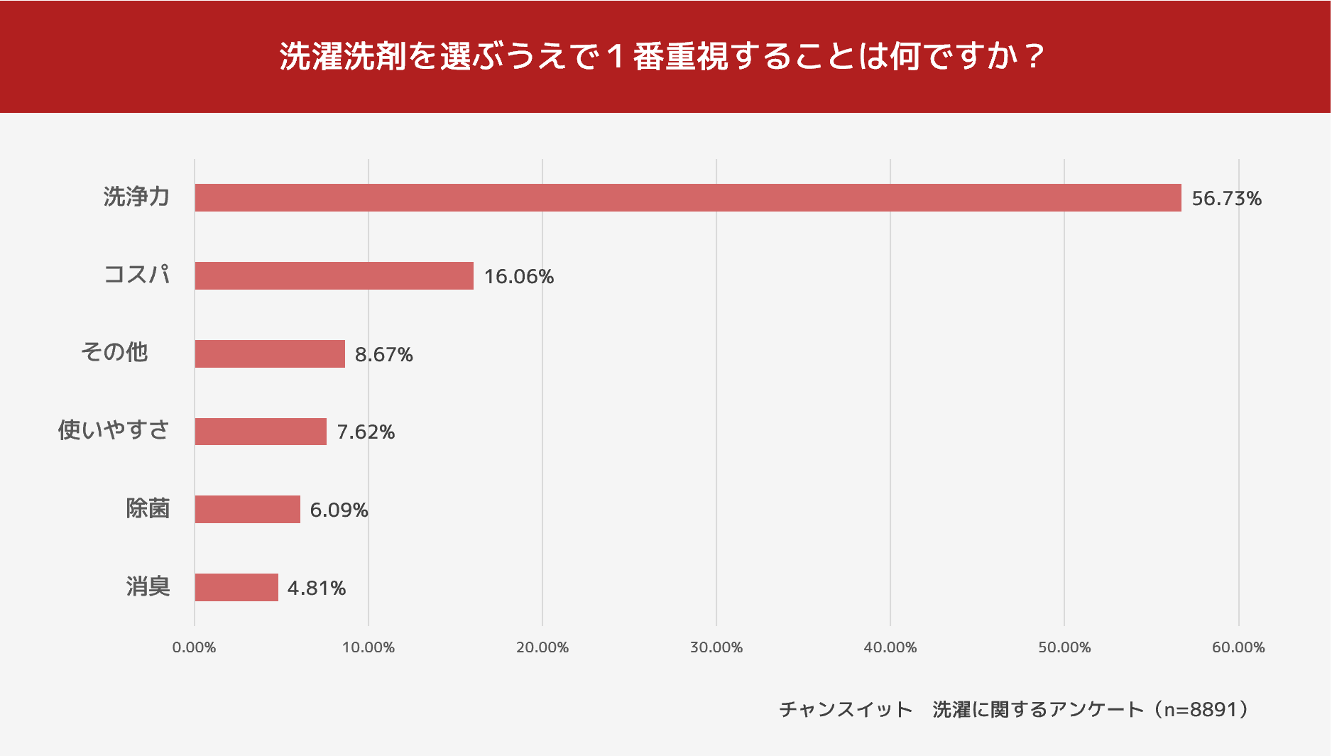 - 洗濯洗剤を選ぶ際に1番重視する点は「洗浄力」56.7%。2番目に重視する点は「消臭力」「除菌力」「コスパ」が横並び。