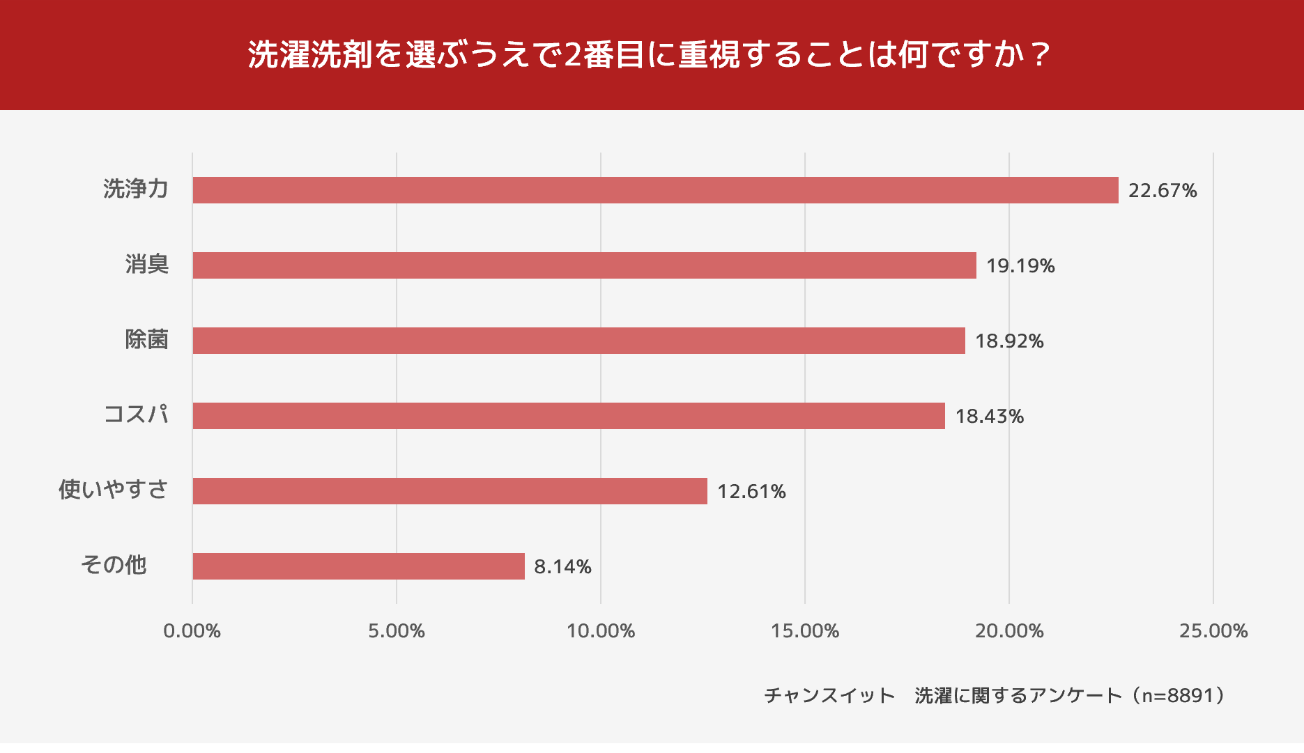 また、2番目に重視する項目の上位は「消臭力」19.19%、「除菌力」18.92%、「コスパ」18.43%という結果でした。
