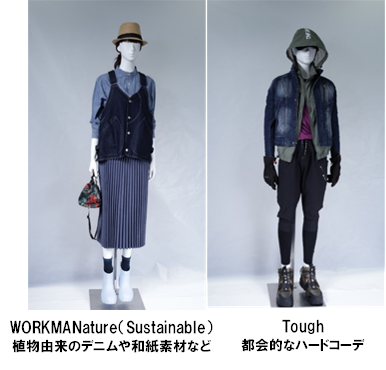 前回までは製品カテゴリーや機能別の展示でしたが、今回は方針を大転換します。メインのエントランススペースで以下の5種類のスタイルをワークマン的に「飛ばした」コーデでブランドとして表現します。ワークマンは本展示会を機に最強コスパ製品を多数投入しますが、今後は機能性だけでなくデザイン性でも選ばれる製品にします。これにより一般のアパレル(裏にはステルス機能満載で他社とは差別化)市場に本格参入します。
