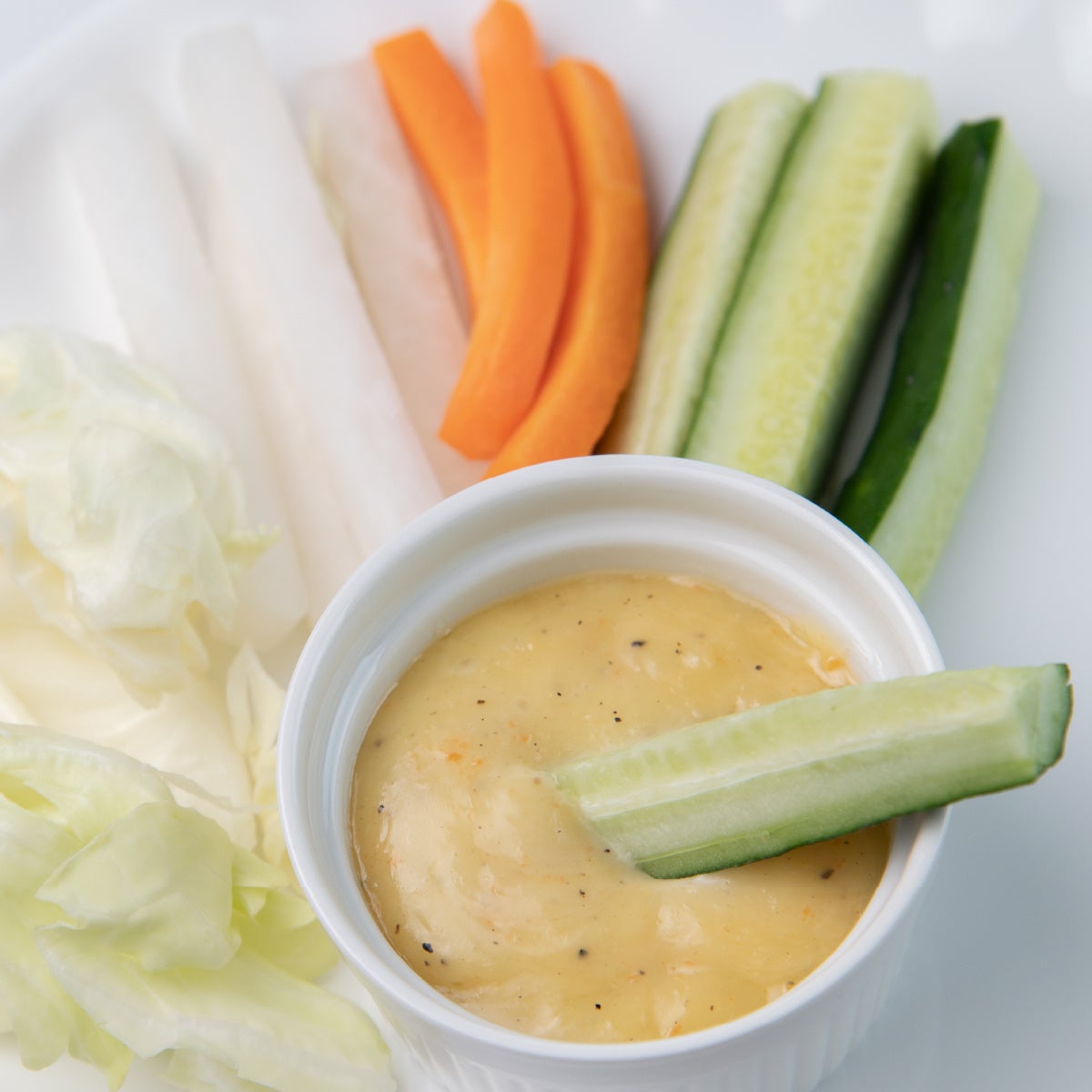 無数のお客様が清里で体験してきた“あの味わい”を、ご自宅のテーブルでも完璧に再現できるよう、試行錯誤を経て粘度などを微調整しながら開発した今回のパッケージ。カレーと交互に口へ運ぶうえで最適な風味となるよう、あえてビネガーを使わず、塩・卵・ブラックペッパー等でマイルドなフレーバーにまとめたサラダソースです。