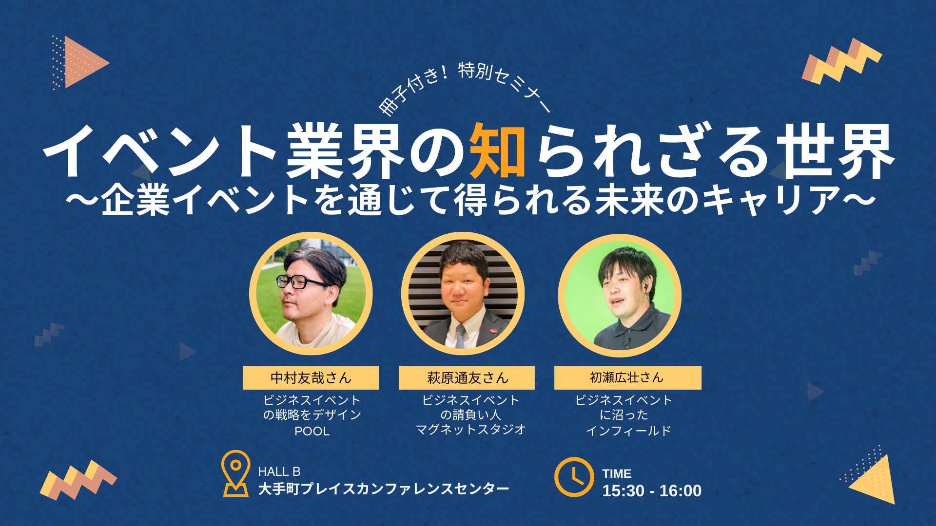 キャリアアップセミナーでは、実践講座 「実践的なイベントノウハウをまるッと習得する講座(短縮版) -学生・業界/業務初心者向け-」(18:00〜19:00)として株式会社ホットスケープ代表取締役/株式会社カンファレンスファクトリー代表取締役の前野伸幸さんによる実践講座を実施。また、[冊子付き]特別セミナーとして「イベント業界の知られざる世界 〜企業イベントを通じて得られる未来のキャリア〜」(15:30〜16:00)にて、ビジネスイベントの戦略や実務を実践する株式会社POOL代表取締役中村友哉さん、株式会社マグネットスタジオ マーケティングプランナーの萩原通友さん、株式会社インフィールド初瀬広壮さんの3氏が登壇し、「業界知識」や「職業知識」の視界を良好にすることで、職業選択やキャリアプランを全力でアシストします。