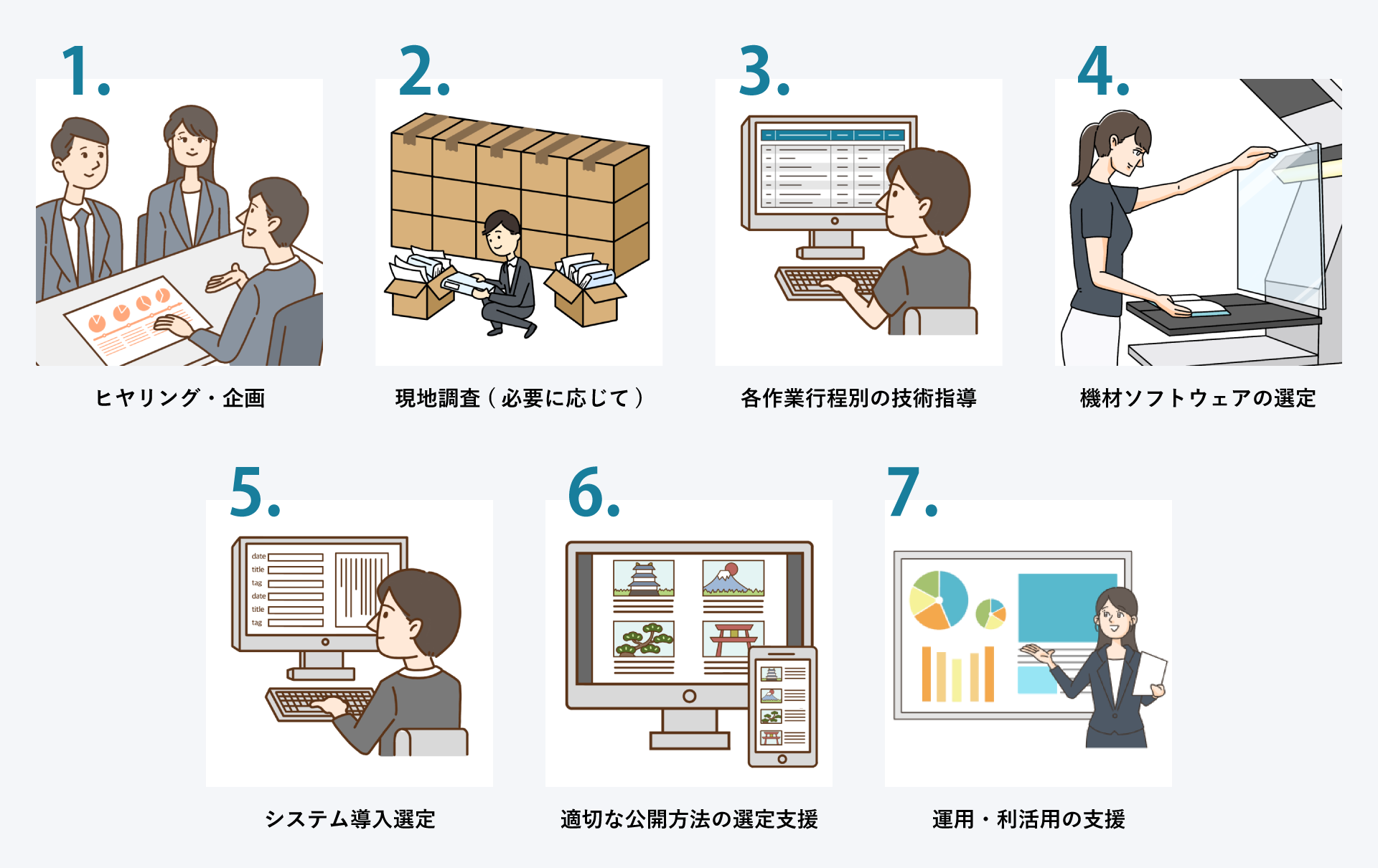 デジタルアーカイブの構築には、利用目的の明確化、電子化する史資料の分類方針策定、適切な電子化手法やシステムの選定、「IIIF(※1)」などデータの公開規格の策定、著作権・公衆送信権など法律面の検討、公開後の利活用促進など、様々な観点での専門知識が求められます。また理想的なデジタルアーカイブのあり方はお客様によって大きく異なり、万能な構築方法はありません。