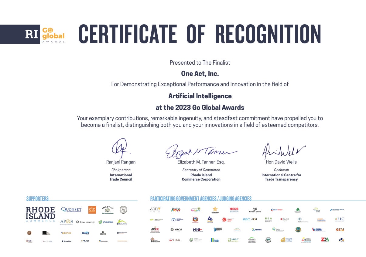 株式会社ONE ACT(本社:東京都中央区、代表取締役:浅野 裕亮)は「The 2023 Go Global Awards」において、世界83カ国3,600社を超える対象企業から選出されたファイナリストとして準優勝を受賞し、昨年11月6日から11月8日の3日間にわたり米国ロードアイランド州で開催された授賞式に出席しました。