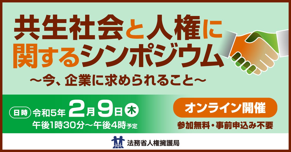 グローバル化による経済発展の一方、世界は、格差の拡大や紛争による分断など様々な課題に直面しています。これらの課題に対処していくためには、国と企業が相互に補完し合いながら、共生社会を実現し、持続可能な経済・社会を営むことが不可欠です。「「ビジネスと人権」に関する行動計画」を踏まえ、令和4年9月には「責任あるサプライチェーン等における人権尊重のためのガイドライン」が策定され、企業による人権尊重の取組を促進する機運は高まっています。本シンポジウムでは、共生社会の実現という観点から、「今、企業に求められること」を考えます。