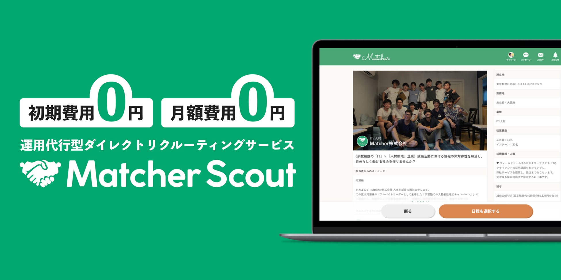 初期費用0円・月額費用0円の新卒向け運用代行型ダイレクトリクルーティングサービス。導入企業数400社、内定支援実績900件。