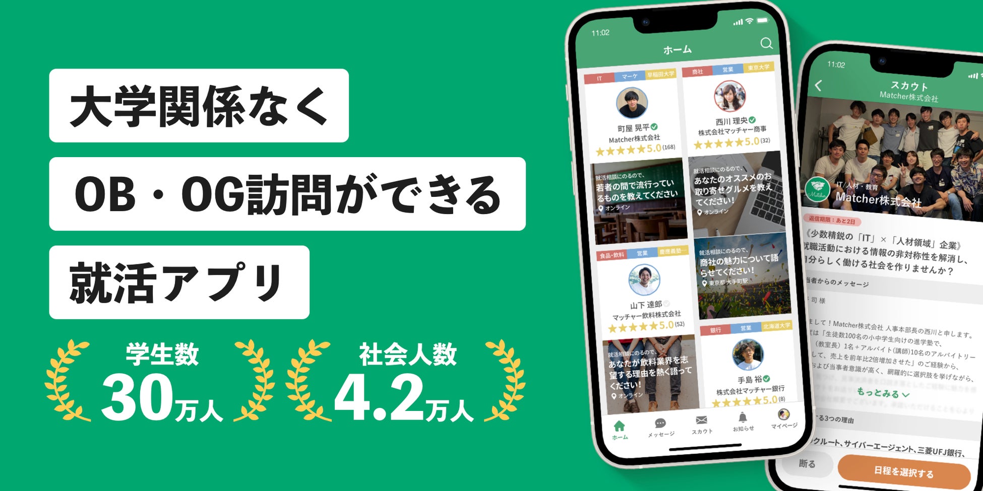 所属大学に関係なく、簡単にOB・OG訪問ができる就活アプリ。「学生の使いやすさNo.1(※1)」のOB・OG訪問アプリにも選出されており、現在では学生30万人、社会人4.2万人に利用され、累計マッチング数は100万件を突破しています。