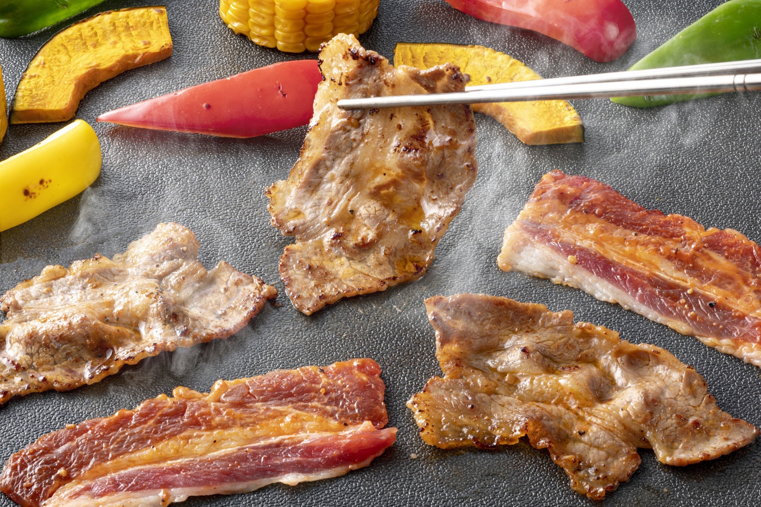 こだわりのヤンニョムであるおろしニンニクと粒感のあるニンニクを使用し、黒胡椒で味を引き締めたごま油香る塩ベースのタレで、厚切りの豚バラ肉に味付けしました。包み野菜やキムチと一緒に食べていただくことで、さらに美味しく召し上がっていただけます。