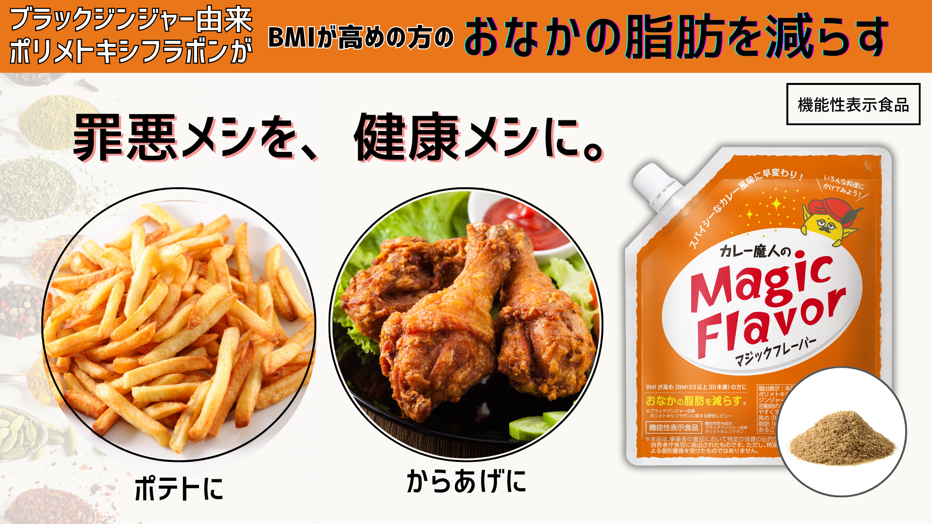 そして、今回発表の第3弾は、お料理をしない方も罪悪感を感じる食事にふりかけるだけ。おなかの脂肪を減らす(※2)「カレー魔人のマジックフレーバー」です。