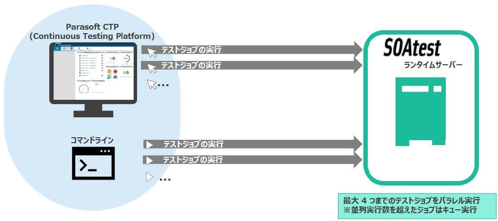 これまでのバージョンでは、CLI実行(コマンドライン実行)は、1つのテストジョブの順次実行のみの対応でしたが、Runtime Server Edition(.warデプロイメント版)の強化により、最大4つまでのテストジョブの並列実行が可能になりました。また、テスト実行中に新しいテスト実行の指示を受け取った場合、テスト実行指示を拒否せず、テストジョブをキューに登録し、実行中のテストジョブ数が並列実行数の上限以内になったタイミングでキューに登録されているテストジョブを実行します。これらにより、複数の開発者によるコードコミット(Push)が頻繁に発生するような開発において、コミット(Push)をトリガーに即座にAPIテストを実行するCIプロセスを強化し、開発を効率化します。