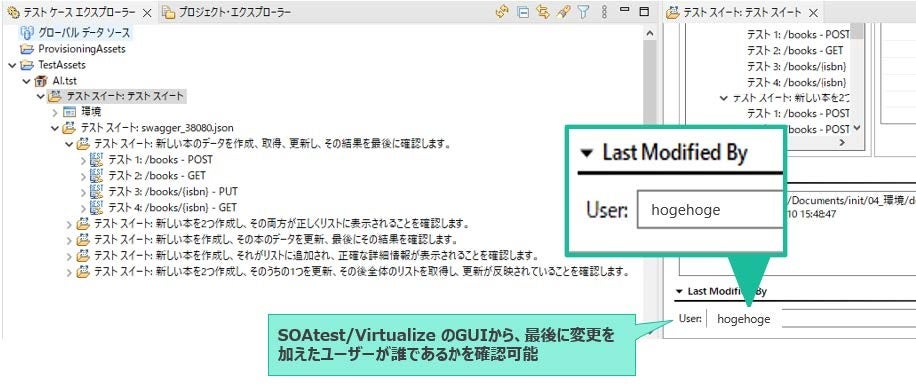 テストスイート(.tst)、レスポンダースイート(.pva)、アクションスイート(.pvn)、メッセージプロキシ(.pmpdd)、仮想アセット(.pvadd)を変更した最後のユーザーが誰か、これらの資産にユーザー情報が保存されるようになりました。これにより、SOAtest/VirtualizeのGUIから、最後に変更を加えたユーザーが誰であるかを確認できるようになりました。