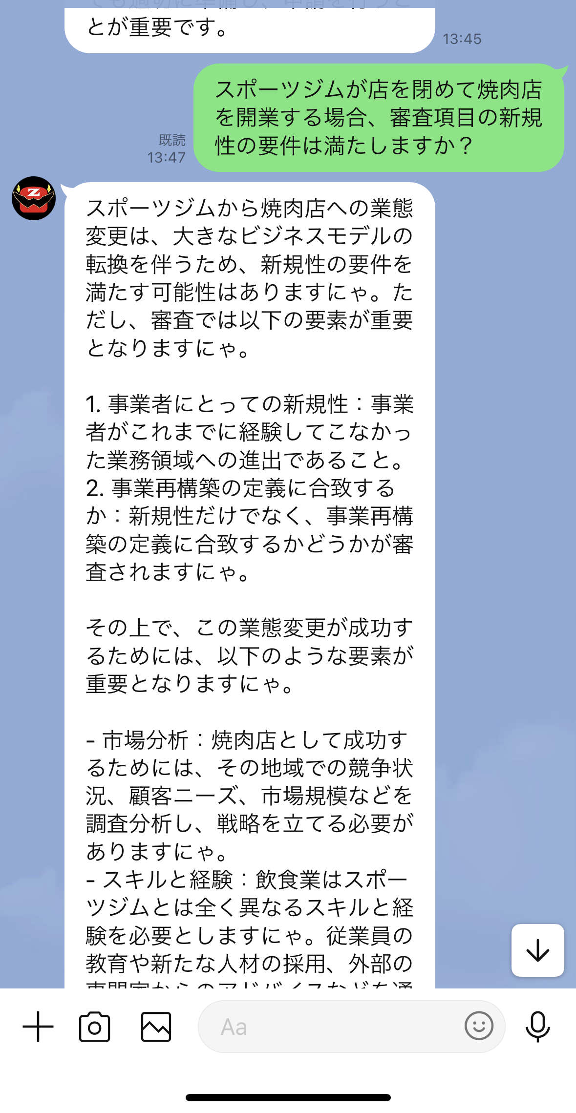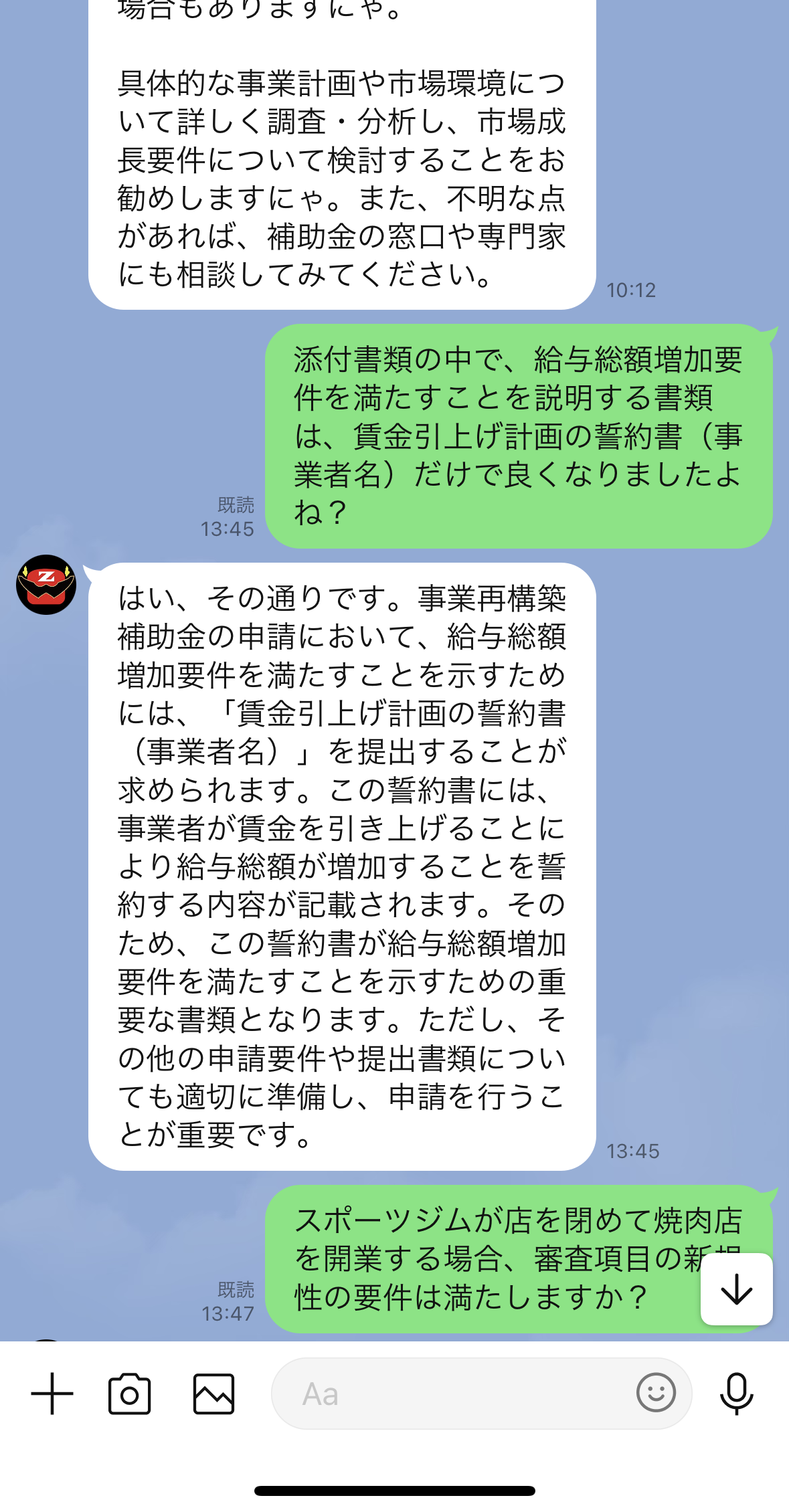 補助金支援CopilotAI「ズバッと(β)」は、事業再構築補助金について専門学習したAIです。さらに早くなったOpenAI社のGPT-4-0613を装備。LINEチャット形式で申請支援を行います。