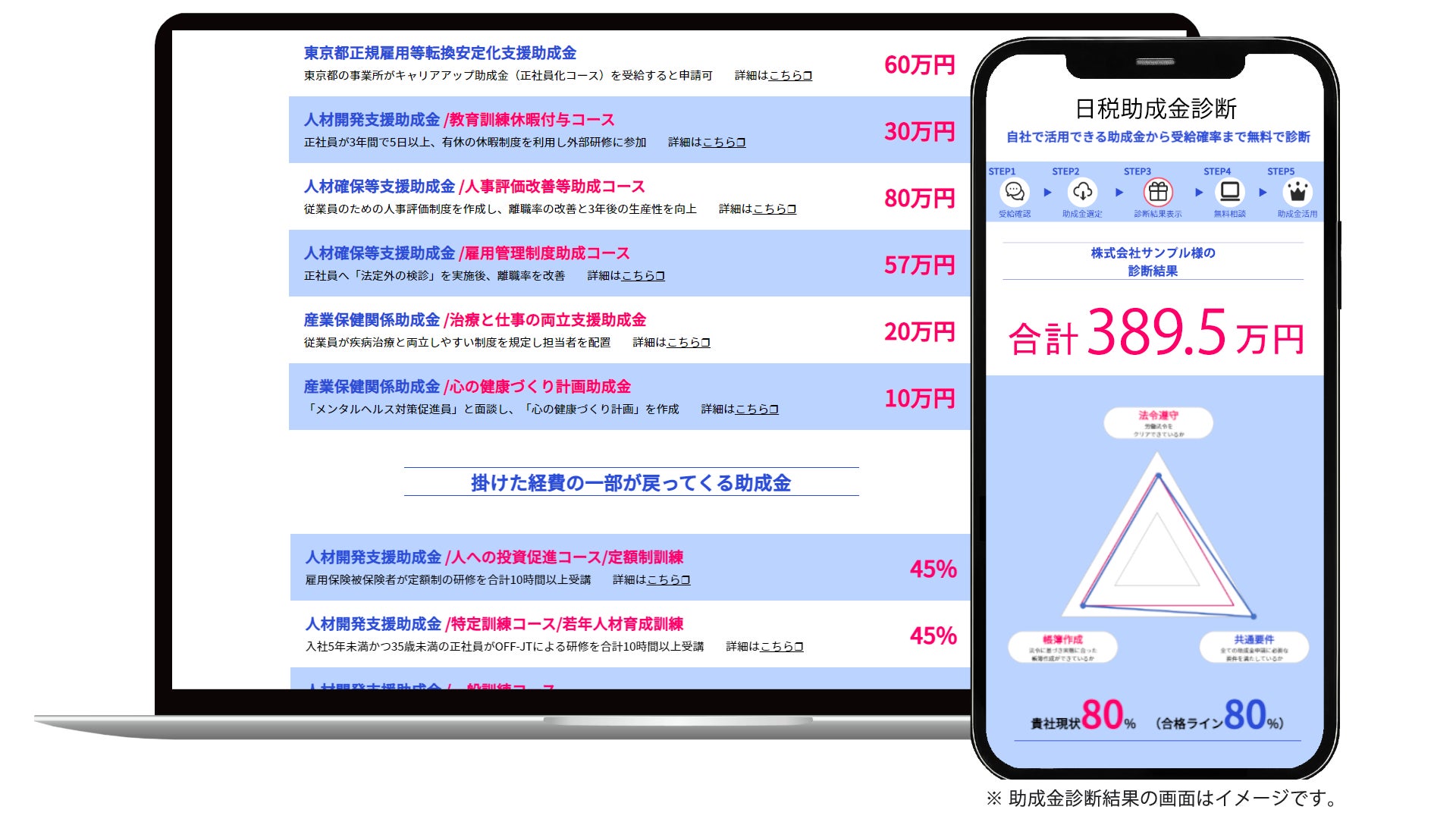 5分でできるWeb診断で、受給できる可能性のある助成金の種類・金額や受給確率をすぐにご案内