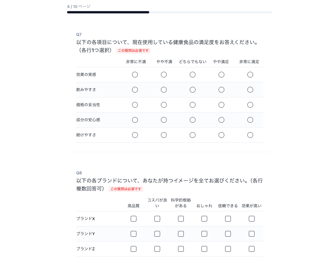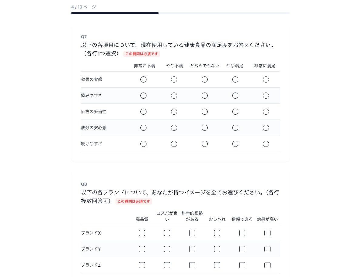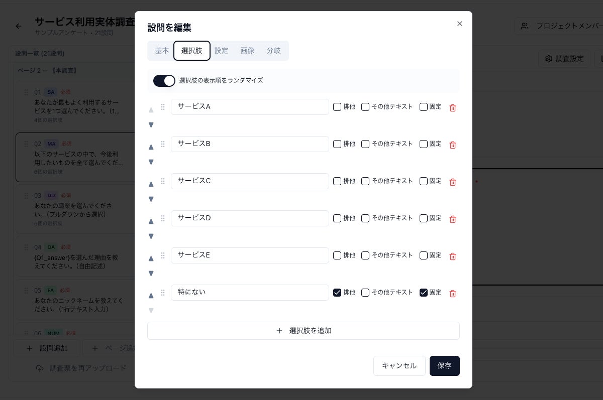 単一回答(SA)、複数回答(MA)、マトリクス、ランキング、NPS、コンセプト提示など、マーケティングリサーチの実務で必要とされる21種類の設問形式に対応しています。スキップロジック、表示条件分岐、パイピング、選択肢ランダマイズ、排他選択肢といった高度なロジック機能も備えており、複雑な調査設計にも対応可能です。アンケート画面はマルチデバイスに対応し、スマホから回答しやすいUIを実現しています。