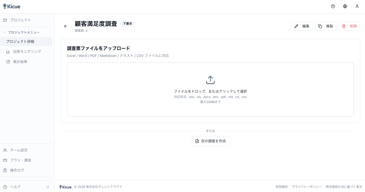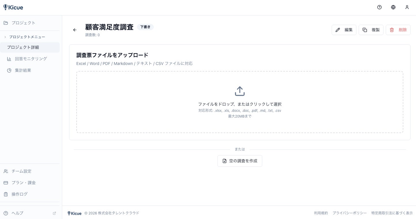 株式会社タレントクラウド(本社:千葉県千葉市、代表取締役:寺師 岳見)は、調査票ファイルをアップロードするだけでAIがその内容を解析し、アンケートフォームを自動生成するAIアンケートシステム「Kicue(ききゅう)」を2026年4月23日に正式リリースしたことをお知らせいたします。