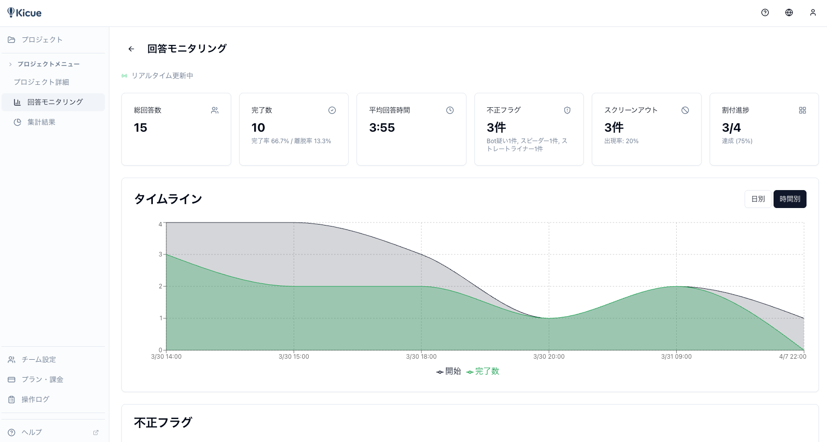 AIエージェントがブラウザを自動操作してアンケートに回答するケースを専用の検知モデルで判定します。回答文の文体パターン、選択肢選好の偏り、マウス・キーボード操作の不自然さを分析し、AI由来の回答をフラグ付けします。加えて、スピーダー検知(極端に短い回答時間)、ストレートライナー検知(同一選択肢の連続回答)、Bot・重複検知(ヘッドレスブラウザ、VPN経由の重複回答)など、従来型の不正回答対策も搭載しています。検知された回答はダッシュボードで確認でき、除外・採用の最終判断はお客様側で行えます。