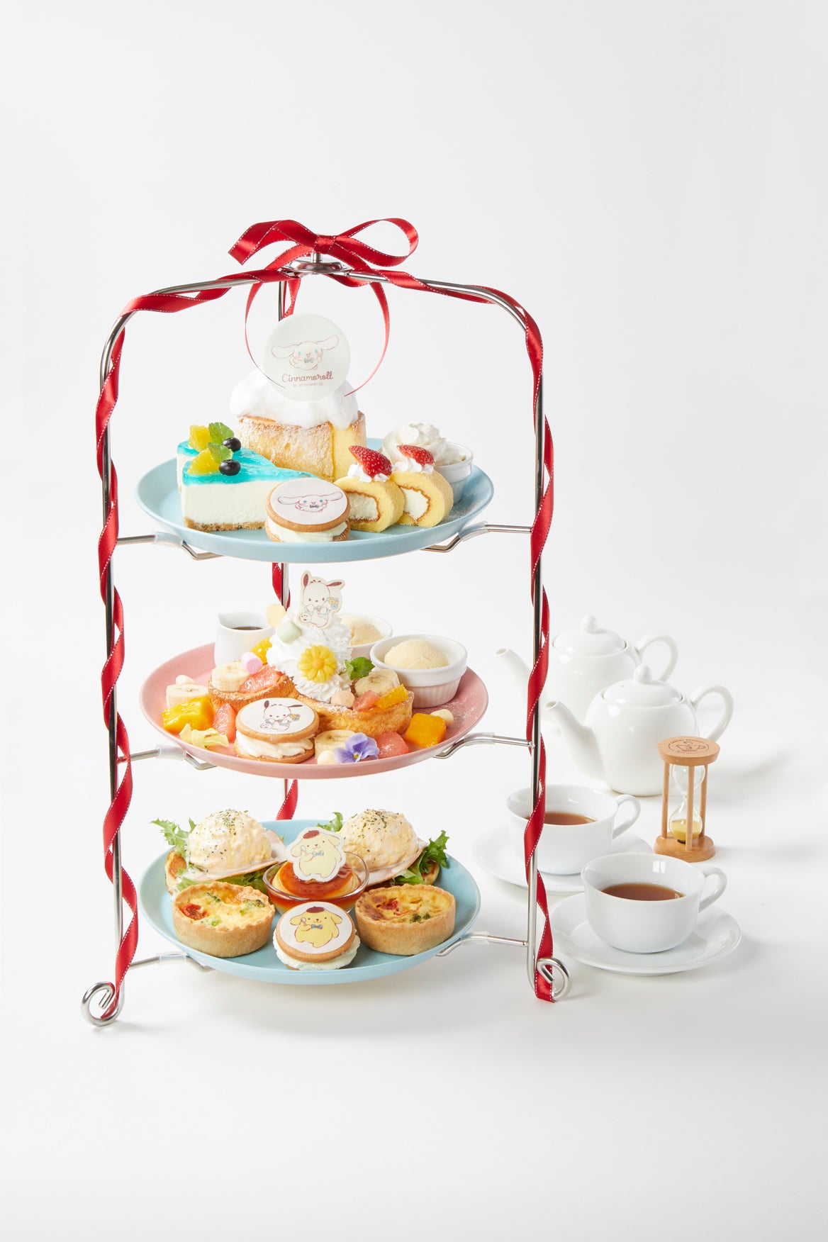 シナモロール、ポチャッコ、ポムポムプリンをイメージしたアフタヌーンティーセット!Butter自慢の2種類のパンケーキと、新登場のレモンシフォンケーキが楽しめます。