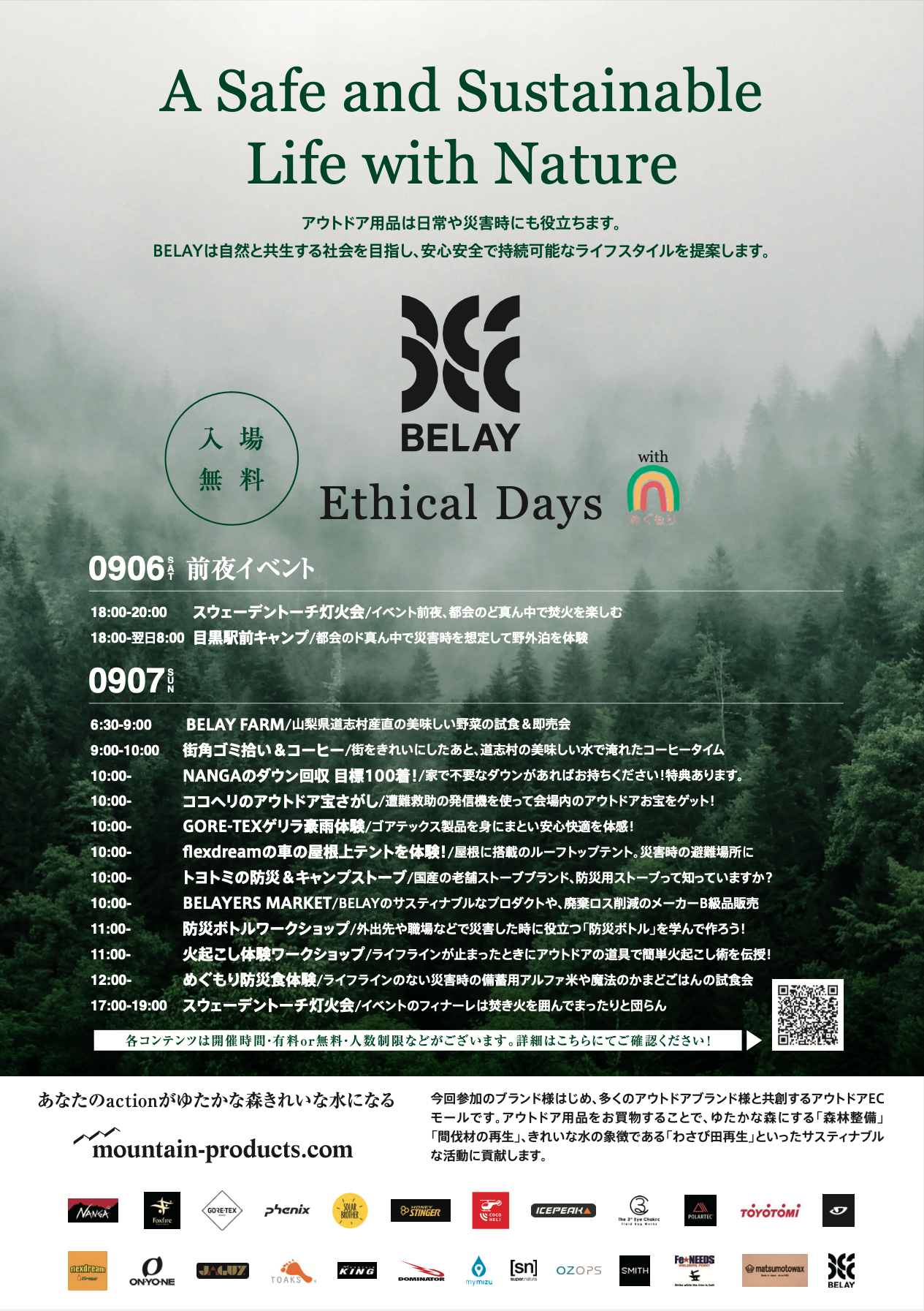 アウトドア用品専門のモール型ECサイト、mountain-products.com (マウンテンプロダクツ ドットコム)を運営、自社のサスティナブルアウトドアブランドBELAYを展開する BELAY株式会社( 本社:東京都目黒区、代表取締役:畑中和彦)は、目黒駅前で地域コミュニティ活動を行う一般社団法人めぐもりと連携し2025/9/6(土)-9/7(日)に「BELAY Ethical Days 」を目黒駅前E-PARKにて開催します。