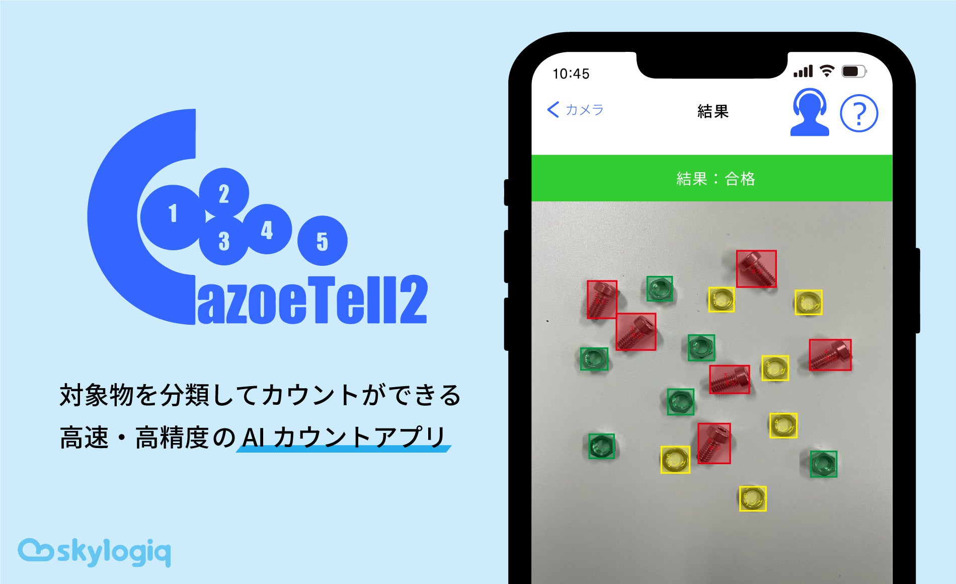 株式会社スカイロジック(本社:浜松市北区、代表:南野真吾)は、AIによる分類カウントアプリ「cazoeTell2」を、本日2023年1月16日にリリースしました。「cazoeTell2」は数えたい物(部品や錠剤など)をスマホやカメラで撮影し、写真の中から対象物の分類とカウントを同時に行い、結果を表示します。AIによる分類カウントで計数作業の手間や数量・在庫管理の労力を削減します。