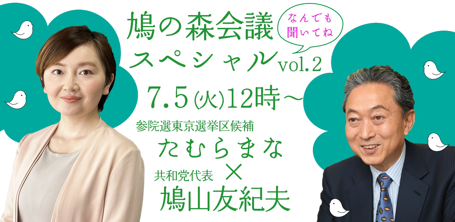 参院選の東京選挙区に共和党から立候補している「たむらまな」と共和党代表「鳩山友紀夫」がどんな質問でも受けて立つ!とオンライン公開質問会を開催します。鳩の森会議スペシャルvol.2 です。