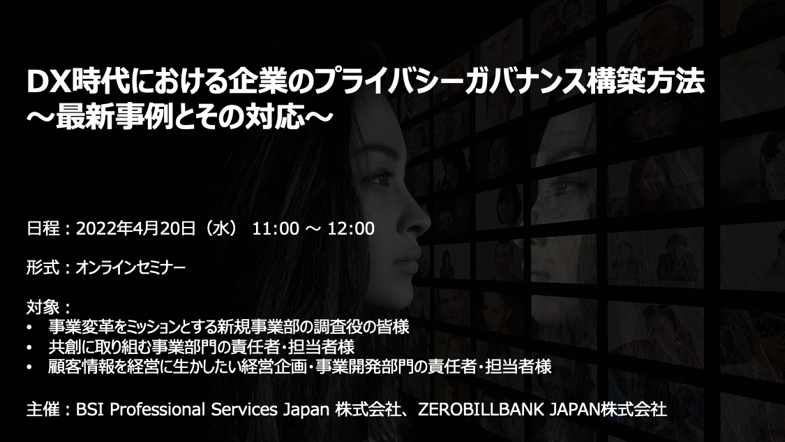 BSI Professional Services Japan 株式会社(神奈川横浜市 代表取締役社長 小島 英彦、以下 BSI PSJ)、ZEROBILLBANK JAPAN株式会社(本社:東京都千代田区大手町、代表取締役社長:堀口純一、https://zerobillbank.com/、以下ZBB)は、DX時代における企業のプライバシーガバナンス構築方法 を最新事例を交えてその対応に言及したセミナーを開催します。