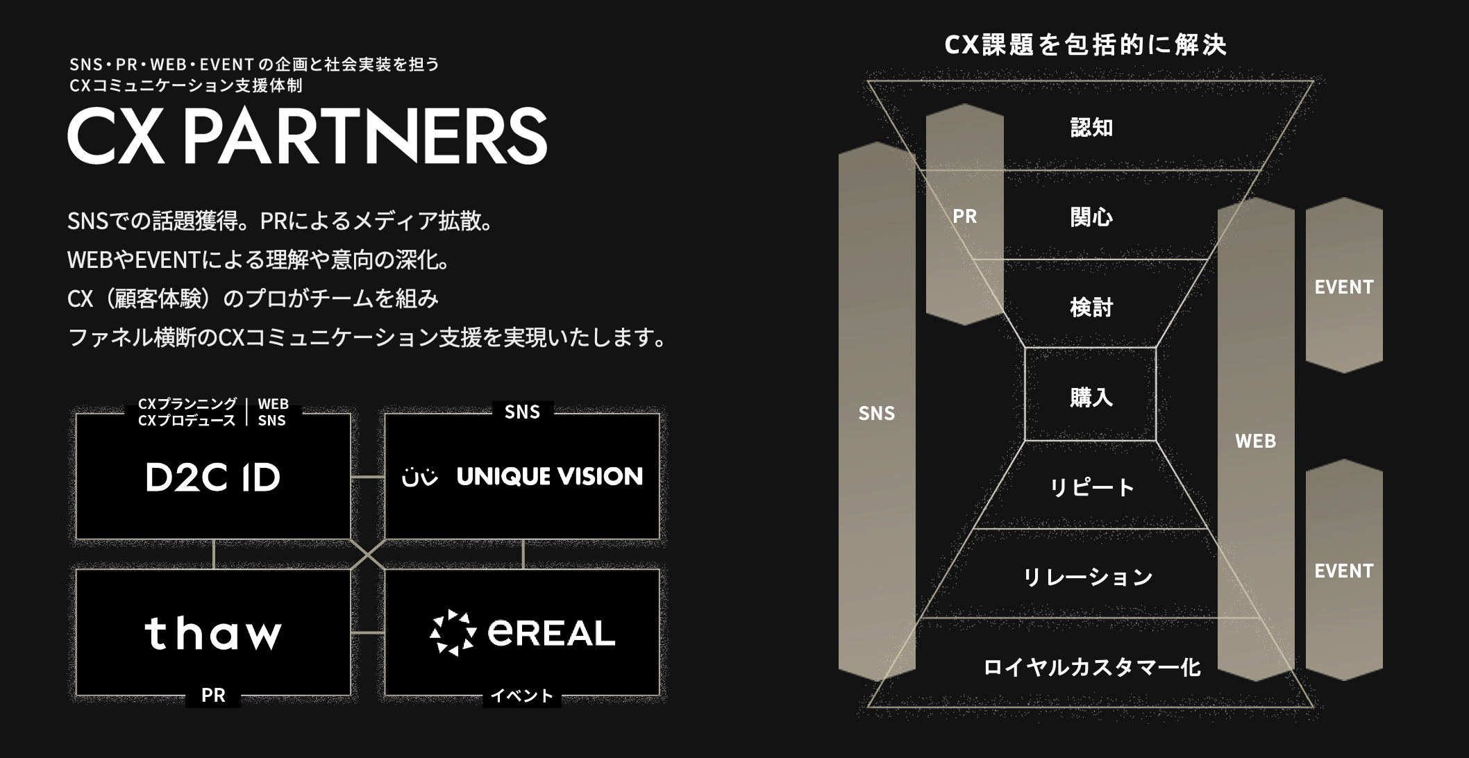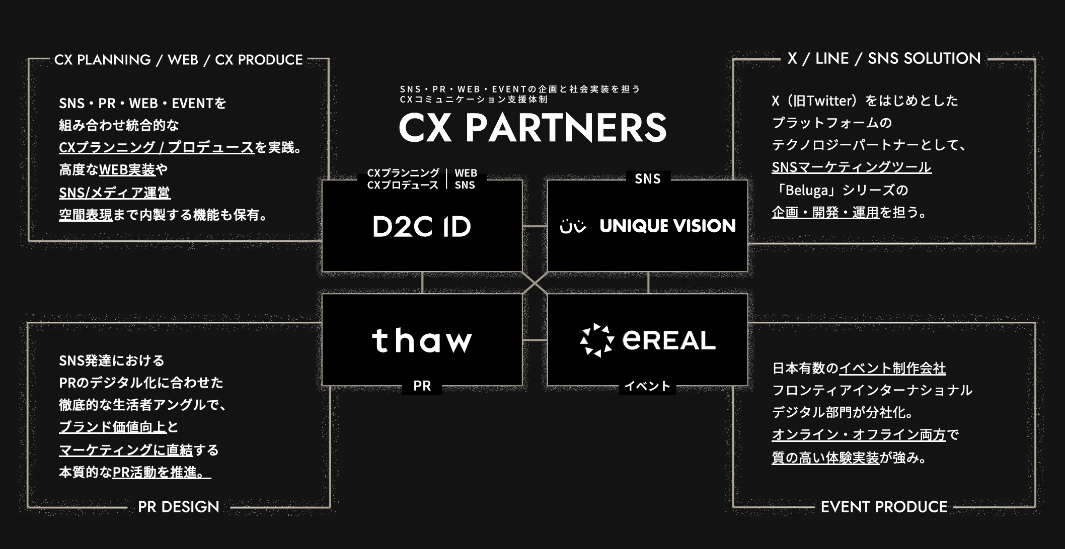 株式会社D2C ID(本社:東京都港区、代表取締役社長:岡 勇基、以下D2C ID)は、ユニークビジョン株式会社(本社:東京都渋谷区、代表取締役社長:白土` 良之 以下、ユニークビジョン)と、株式会社イリアル(本社:東京都渋谷区、代表取締役社長:瀧澤和幸、以下イリアル)、株式会社thaw(本社:東京都渋谷区、代表取締役:濱村 裕也、以下thaw)の4社にて、SNS・PR・WEB・EVENTの専門チームを有するCXコミュニケーションを統合的に支援する体制『CX PARTNERS』の提供を開始したことをお知らせします。