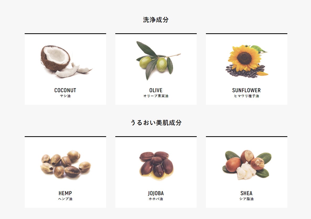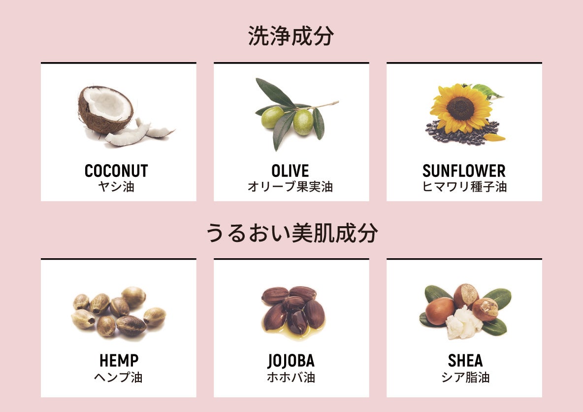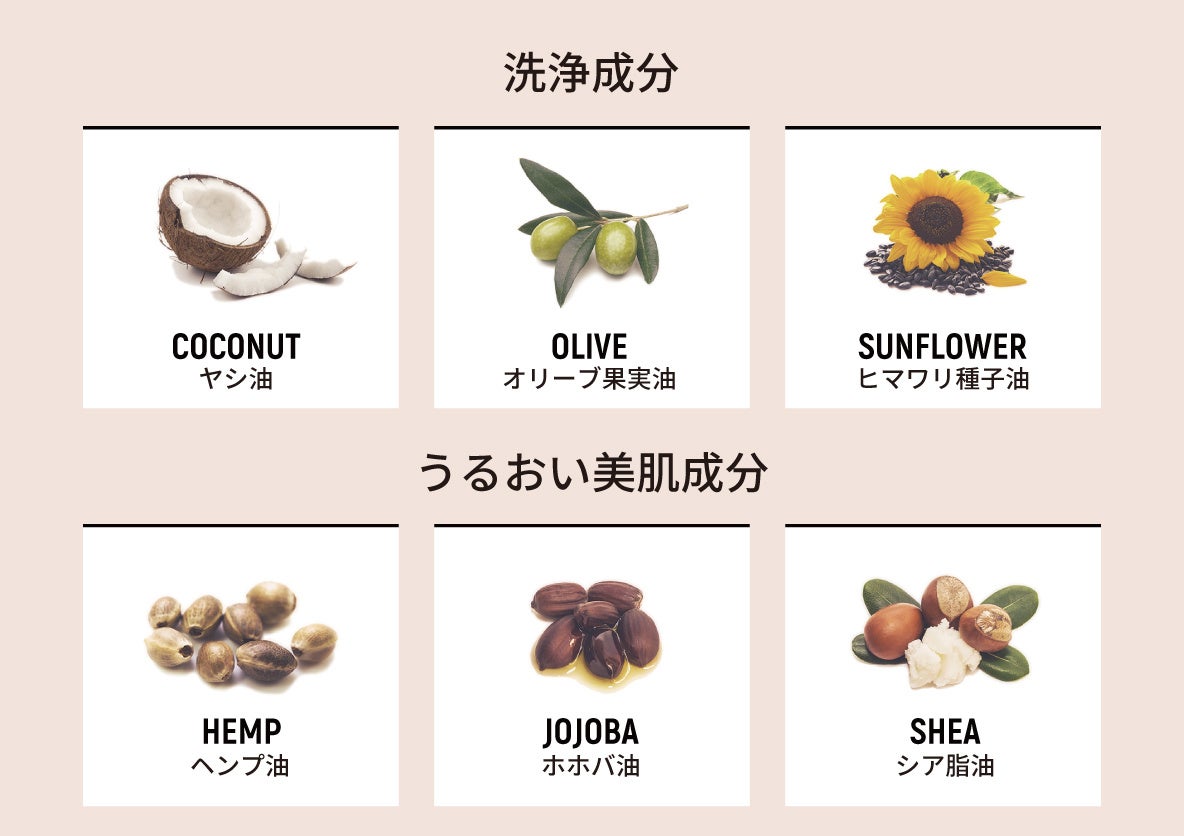絶妙なバランスで処方された洗浄成分(オリーブ果実油、ヤシ油、ヒマワリ種子油)と、うるおい美肌成分(ヘンプ油、ホホバ油、シア脂油)がしっとり スベスベ美肌に洗い上げます。