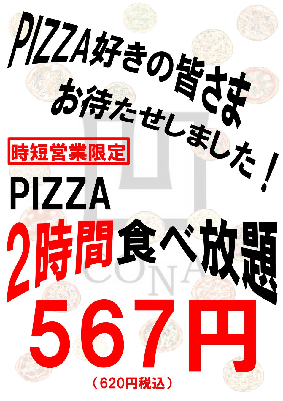 CONA川崎店限定で、2時間ピザ食べ放題を567円(税込620円)でご提供致します。