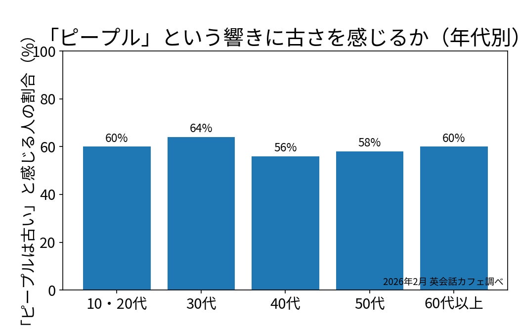 10代・20代だけでなく、30代、40代、そして50代・60代以上においても、およそ6割前後が「ピープルは古い響きだと感じる」と回答しています。