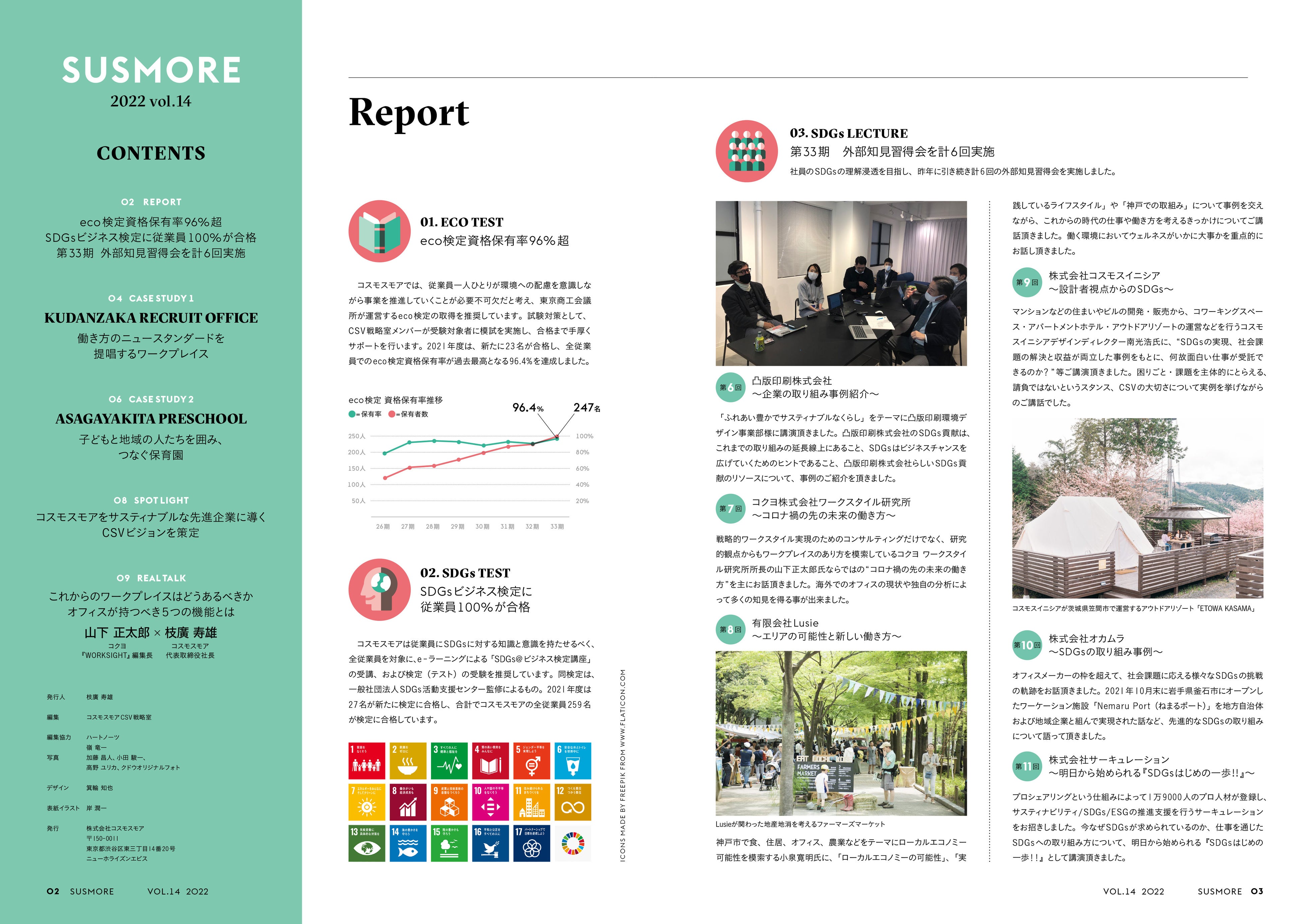 オフィスデザインや総務アウトソーシング事業、リノベーション事業などを展開する株式会社コスモスモア(本社:東京都渋谷区、代表取締役社長:枝廣 寿雄、以下「コスモスモア」)は、事業活動や社内活動のなかでおこなってきたCSRの取組みを収めた年刊誌「サスモア」の vol.14を発行し、2022年5月に当社コーポレートサイトで公開いたしました。社員が本気で環境や社会について考え、日々の業務や取組みに活かし会社全体で社会に貢献していく。そんな「楽しく続けられるCSR活動」の等身大のレポートづくりをコンセプトに制作しています。内容の構成、取材なども社内プロジェクトメンバーでおこない、2008年から毎年発行しています(2020年をのぞく)。