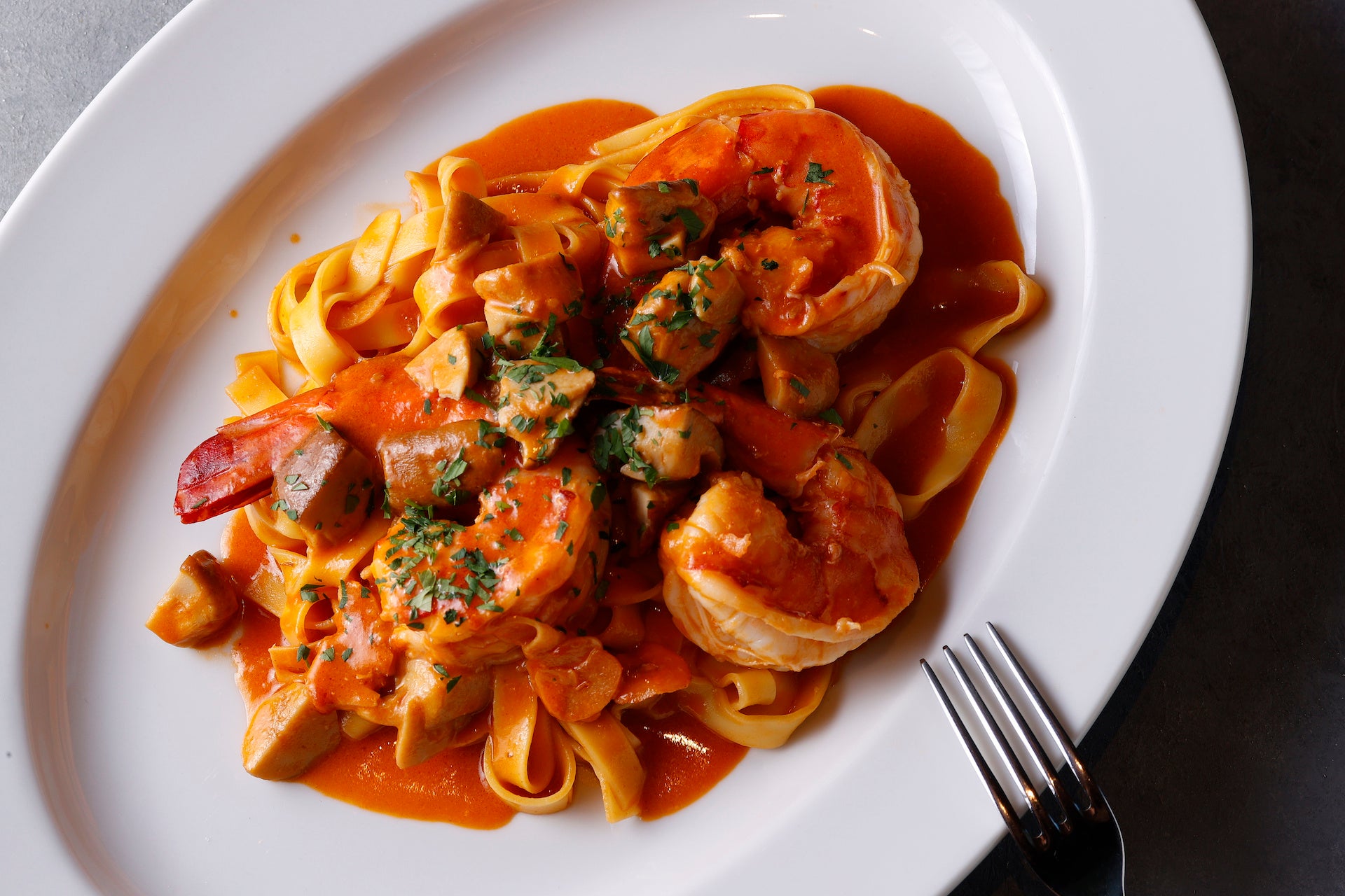 オマール海老から出汁をとった濃厚なビスクソースが魅惑のパスタ「自家製フェットチーネ 大えびとポルチーニ茸のビスクソース」。大えびが3尾も入っており、食べ応え抜群。えびとポルチーニ茸の旨味が最高のコントラストを生んでいる、シェフ一推しの冬の新作メニュー。