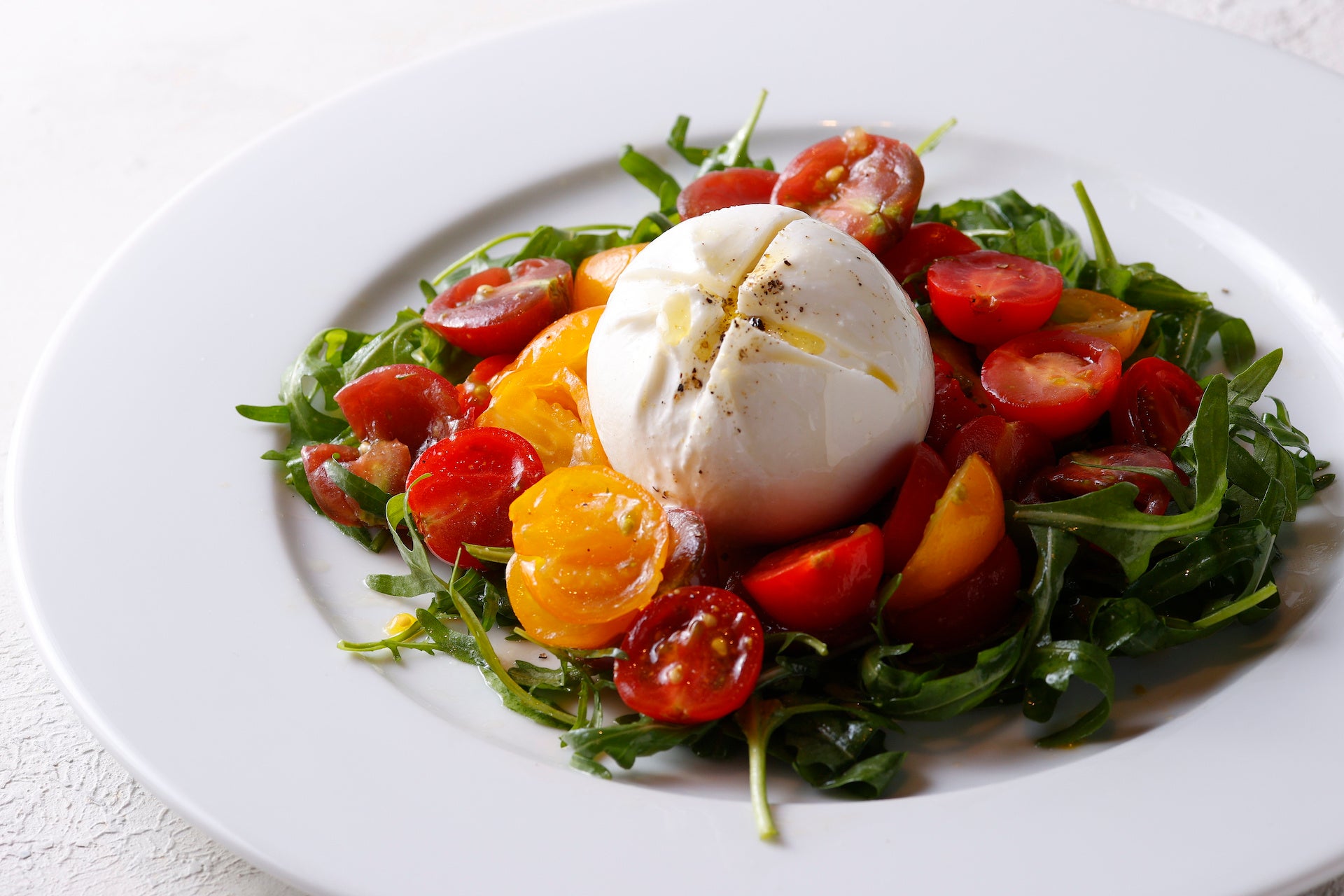 イタリアから空輸で届く新鮮なブラッタチーズを使用した「イタリア産ブッラータチーズとトマトのサラダ」。